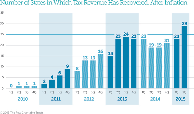 State tax revenue has passed a milestone on the road to recovery. Adjusted for inflation, tax receipts in 29 states had bounced back by the second quarter of 2015 from drops during the Great Recession. This is the first time recovery has widened to a majority of states.