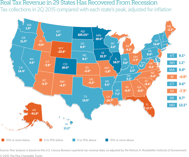 A comparison of each state’s tax receipts in the second quarter of 2015 with its peak quarter of revenue before the end of the recession, averaged across four quarters and adjusted for inflation, shows: