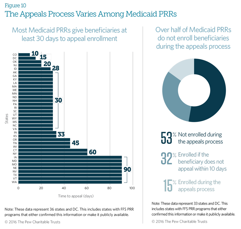 Fifty-three percent of states responding will not enroll the beneficiary in the PRR during the appeals process, and 32 percent will enroll the beneficiary if the beneficiary does not appeal within 10 days of notification.