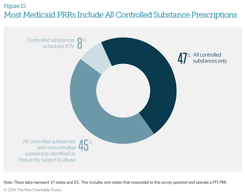 The Drug Enforcement Administration (DEA) classifies controlled substances in five distinct schedules determined by whether the drug has acceptable medical uses and its potential for abuse or dependency. Schedule I includes only illicit drugs with no accepted medical use; all prescription controlled substances are in schedules II-V. Ninety-two percent of responding Medicaid fee-for-service patient review and restriction (PRR) programs indicated that their PRR covers all controlled substances in DEA schedules II-V. In addition to covering all controlled substances, 45 percent of states also include non-controlled drugs identified by that program as frequently subject to abuse, such as those used to treat HIV.5 This means that enrolled beneficiaries will obtain all controlled substances, as well as identified non-controlled substances, through their designated providers. Just three Medicaid PRR programs— in Massachusetts, North Carolina, and West Virginia—do not include controlled substances from Schedule V.