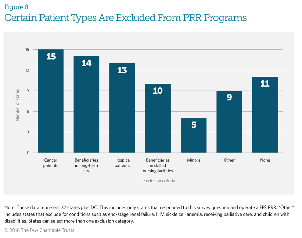 Patients, such as those receiving treatment for certain types of cancer, in hospice, or in long-term care, are typically excluded from PRR programs. Fifteen Medicaid fee-for-service PRR programs exclude from enrollment patients receiving treatment for certain cancers, with 10 states excluding both certain cancer patients and those in hospice care. Six of these programs also exclude patients who are in long-term care, in addition to patients in hospice care and those receiving treatment for cancer. These exclusions help ensure that patients with medical needs have access to effective pain management. Although 11 states indicated that they do not automatically exclude beneficiaries from enrollment, they may choose to do so if the clinical review determines that the medication use is appropriate for these patients’ health conditions.
