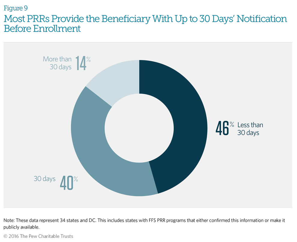 Beneficiaries receive notice, usually written, of their identification for inclusion in a patient review and restriction (PRR) program before their enrollment occurs. The notification explains the beneficiary’s right to appeal. Most programs also provide beneficiaries with instructions on how to give input on designated providers. Most responding fee-for-service PRRs indicated that their staffs provide beneficiaries with written notification up to 30 days before enrolling the patient in the PRR. Only two states—Connecticut and West Virginia—give beneficiaries 60 or more days’ notice.
