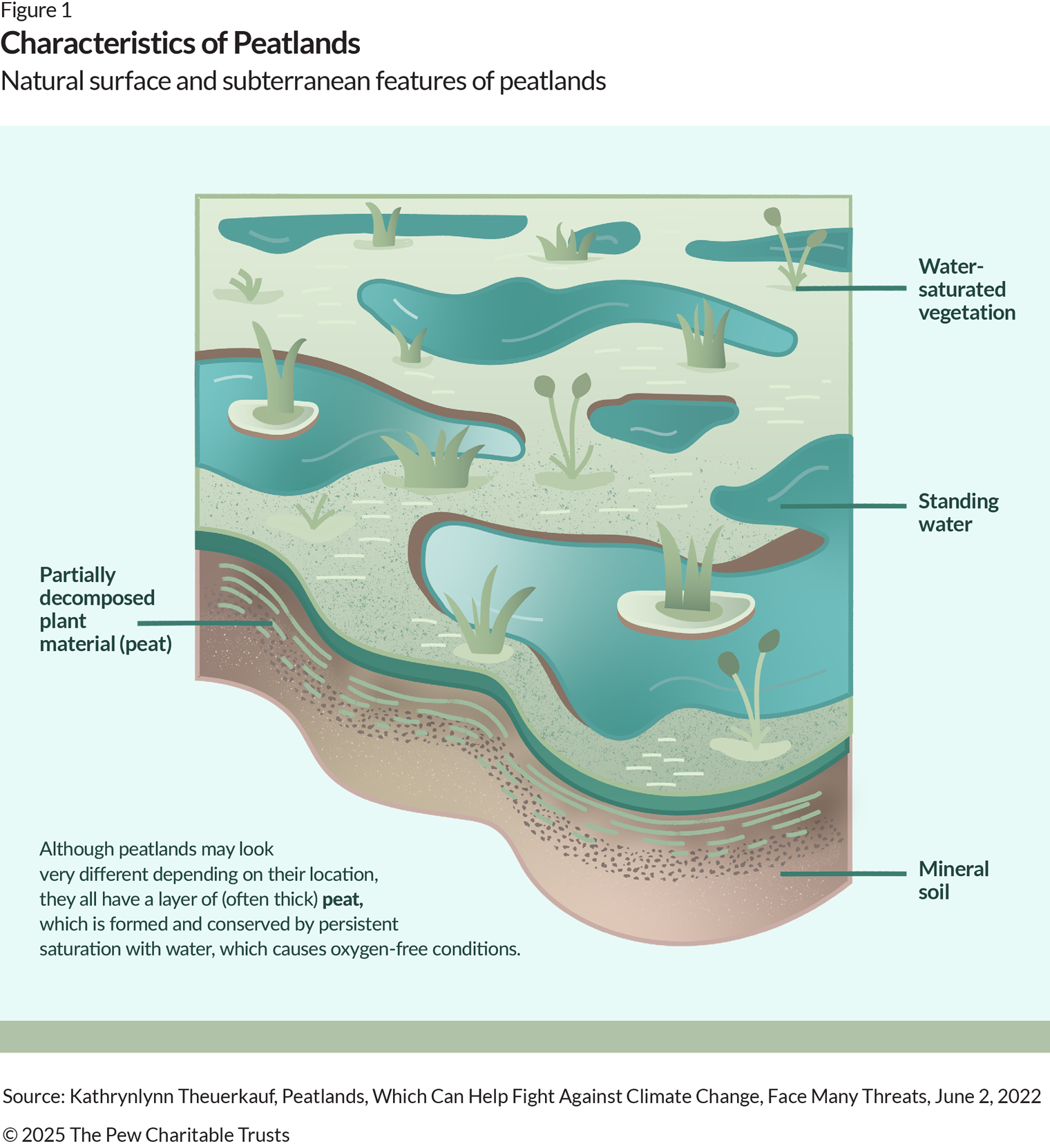 Peat is a spongy, carbon-rich organic soil that forms when low-oxygen, waterlogged conditions significantly slow the decay of dead plant matter, primarily mosses, sedges, grasses, and other wetland vegetation.5 As dead plant matter accumulates over time, thick peat layers form, typically 6 to 16 feet deep each.6 (See Figure 1.) This process, coupled with local factors such as hydrology, elevation, and vegetation, yields the variety of peatland types, such as bogs (fed by rainfall) and fens (fed by groundwater).7 If left undisturbed, these wetlands accumulate massive amounts of carbon over millennia.