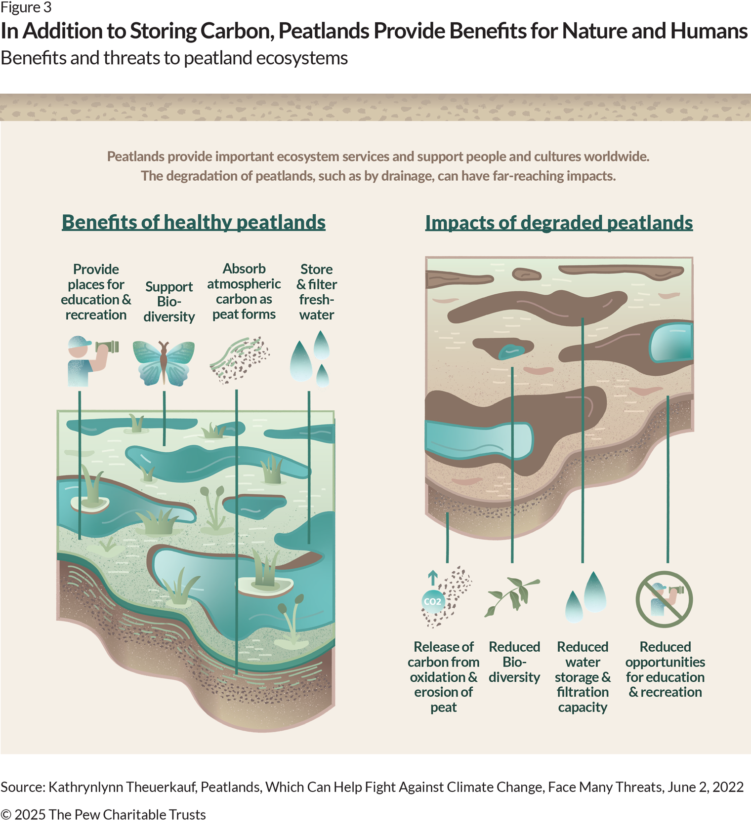 When healthy, peatlands—also known as fens, bogs, mires, marshes, pocosins, and swamps—provide enhanced benefits compared with degraded peatlands, including better flood prevention, improved water quality, reduced risk of catastrophic wildfire, and increased cultural and recreational opportunities.2 Protecting healthy peatlands and restoring degraded ones can help sustain these habitats’ many benefits to people and nature.3