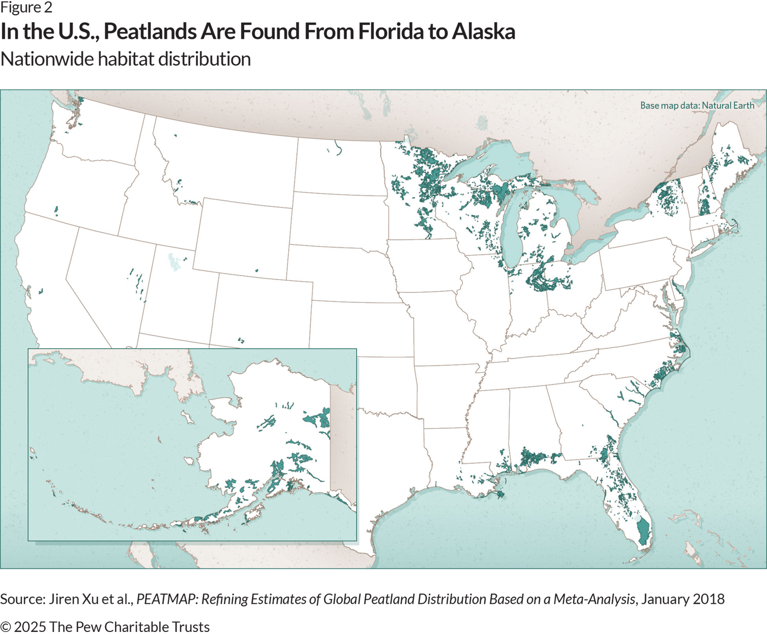 Peatlands are located in coastal and inland environments of tropical, temperate, and polar regions. They cover approximately 3% of the Earth’s surface and store twice as much soil carbon as all the world’s forests combined.8 In the U.S., peatlands are found at virtually all latitudes, with large swaths in Alaska, the Great Lakes region, and Florida.9 (See Figure 2.) The Pew Charitable Trusts is working with partners to better understand the extent of peatlands throughout the U.S. and determine where conservation and restoration efforts would yield the most benefits for reducing carbon pollution.