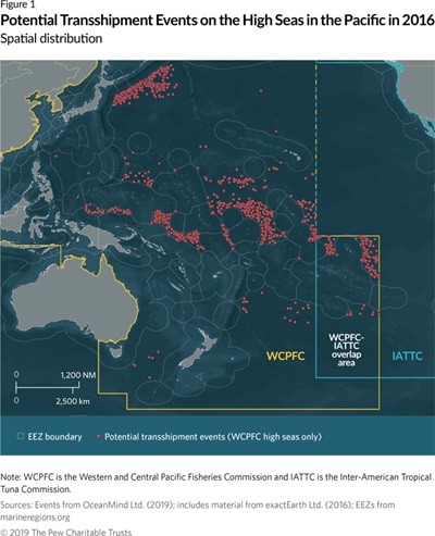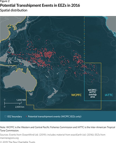 The high number of potential transshipments in these two regions of overlapping RFMO waters increases the odds that some events and accounting of species may go unreported to the appropriate organization unless both commissions institute strong monitoring and reporting mechanisms.