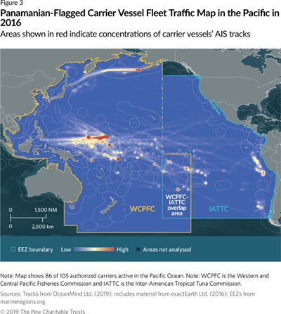 Figure 3 shows the movements of 86 Panamanian-flagged carrier vessels in the central part of the Convention area, primarily in the EEZs of the Marshall Islands and Federated States of Micronesia. The red areas indicate a high number of vessel visits to Pacific ports—which probably involved transfers of skipjack tuna caught by purse seine fleets, which are required to transship in port and not on the high seas or in an EEZ.