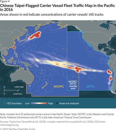 In contrast to the Panamanian-flagged carrier vessels, the movements of 16 carrier vessels flagged to Chinese Taipei were concentrated on the high seas, especially in waters of overlapping RFMO jurisdiction, which suggests that these vessels interacted more with longline fleets than purse seiners and probably transshipped bigeye and yellowfin tuna (Figure 4).