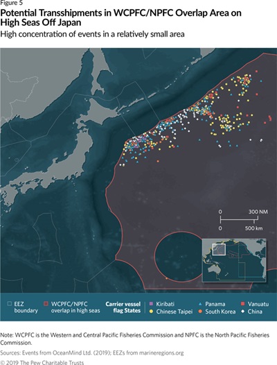 The report found a high concentration of potential transshipment activity where waters managed by the WCPFC overlap with those managed by the Inter-American Tropical Tuna Commission (IATTC) and the North Pacific Fisheries Commission (NPFC). In fact, over half of all AIS-detected potential high seas transshipments took place in two relatively small regions of overlapping RFMO jurisdiction: on the high seas off Japan and in the IATTC/WCPFC overlap area in the central Pacific.