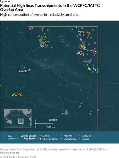 Figure 6 shows potential high seas transshipments in the IATTC/WCPFC overlap area by WCPFC-authorized carrier vessels flagged to six cooperating non-members. Vessel movements indicate that as many as 216 transshipments involving 22 carrier vessels may have occurred in this relatively small area of the Pacific jointly managed by the two RFMOs.