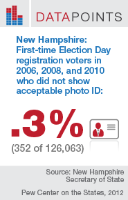 In New Hampshire—where Election Day registration has been in use for more than 15 years—126,063 first-time voters registered and cast ballots on Election Day during the 2006, 2008, and 2010 general elections, combined. Of these nearly 130,000 voters, just 352 did not produce some form of acceptable photo identification at the time of their Election Day registration and voting.
