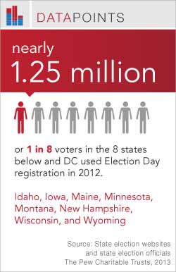 In the eight states — Idaho, Iowa, Maine, Minnesota, Montana, New Hampshire, Wisconsin, and Wyoming — and the District of Columbia that allow Election Day registration, nearly 1.25 million voters registered or updated their information and cast ballots on Election Day last November. Therefore, approximately 1 in 8 ballots cast in these states and the District of Columbia involved Election Day registration.