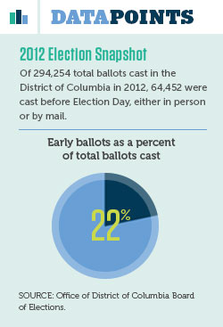 The 2012 election was also the first presidential election in which District residents could vote without an excuse at early voting centers. More than 1 in 5 voters cast ballots either in person or by mail before Election Day, compared with 1 in 10 voters in 2008. Even with so many early voters, the city had the nation’s second-longest average wait at the polls, at 34 minutes, behind Florida.