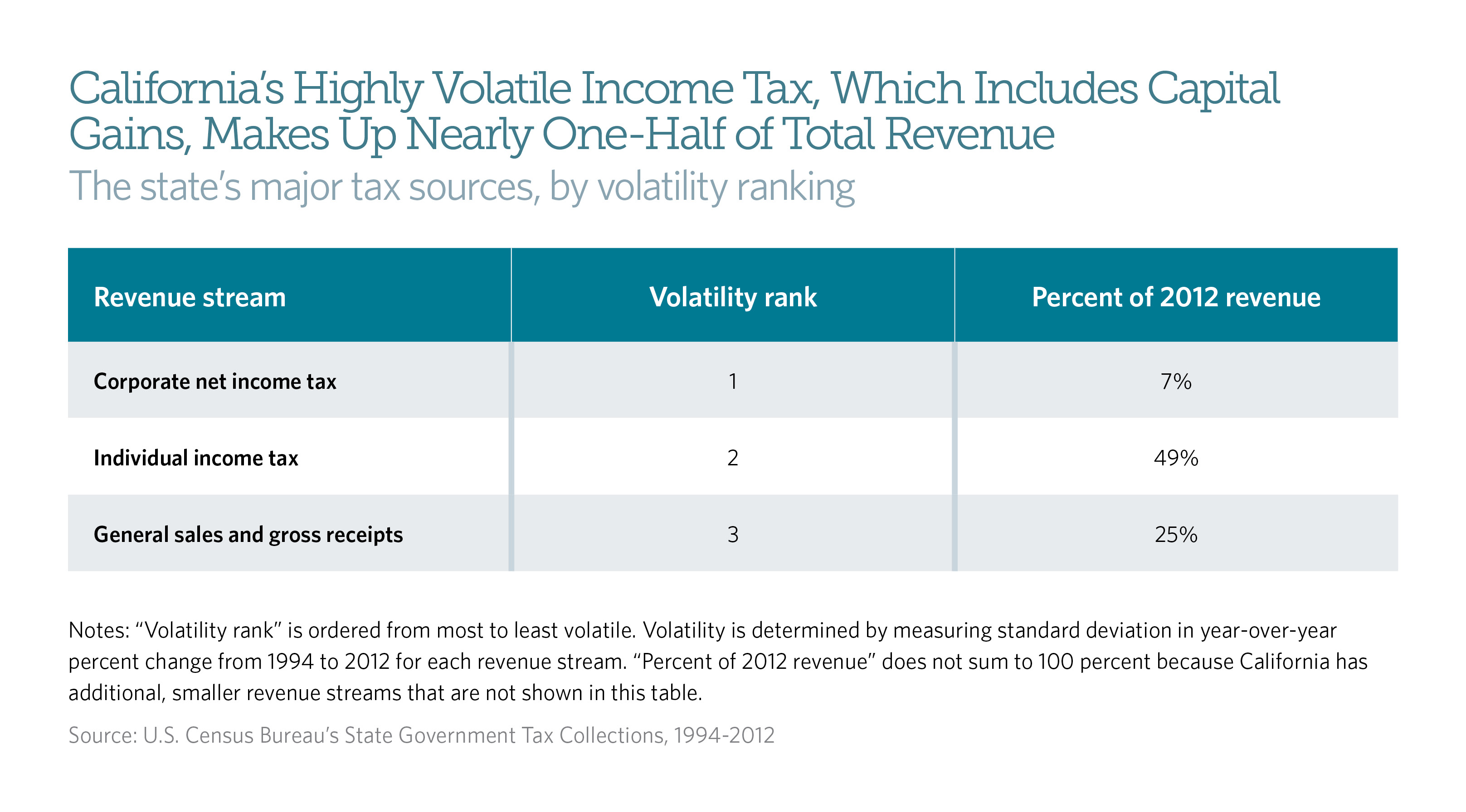 Elizabeth G. Hill, “Revenue Volatility in California” (Sacramento: California Legislative Analyst’s Office, January 2005), http://www.lao.ca.gov/2005/rev_vol/rev_volatility_012005.pdf; see also Mac Taylor, CalFacts 2013 (Sacramento: California Legislative Analyst’s Office, January 2013), http://www.lao.ca.gov/reports/2013/calfacts/calfacts_010213.pdf; Office of Governor Jerry Brown, “Revenue Estimates,” Governor’s Budget Summary 2014-2015, 163.