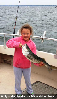 Every summer, the Mules family takes a fishing trip. We welcome new family members, catch up with old members, and spend a day enjoying each other and the beautiful water. This past year, the youngest member of the family, 6-year-old Caroline Kohn (pictured) was also the most successful fisherman, catching a 10-pound striped bass—the largest catch of the day! With the help of her family, my daughter reeled in the 10-pounder and we served him up for a family dinner that night. Clearly, Caroline has inherited her talent from her Aunt Rebecca (aka Aunt Duk Duk), who has competed in local fishing competitions. Aunt Rebecca has instilled her fishing skills and appreciation for the water and its inhabitants to a younger generation, and hopefully Caroline will continue the tradition in years to come. That is why we support the Magnuson-Stevens Act that protects fish populations and helps overfished species recover.