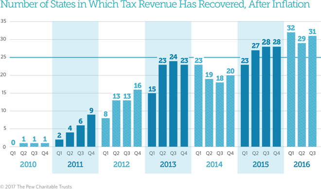 The number of states that have shaken off the effects of the Great Recession and regained their tax revenue levels has risen and fallen, reflecting increased volatility in state tax collections.