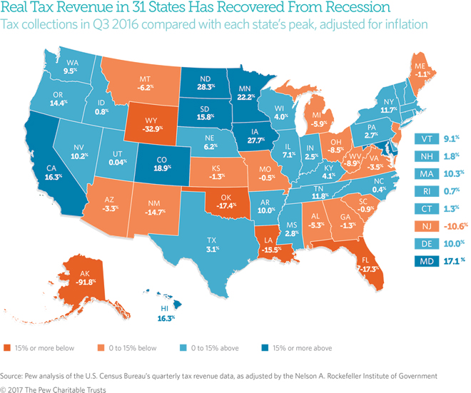 A comparison of each state’s tax receipts in the third quarter of 2016 with its peak quarter of revenue before the end of the recession, averaged across four quarters and adjusted for inflation, shows: