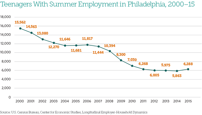 These census numbers do not include unpaid internships, informal work, or summer school. Nor do they include federally funded positions created through programs such as WorkReady Philadelphia. In 2015, WorkReady provided summer job opportunities and paid internships to nearly 9,000 young people using funding from federal and local government sources as well as 125 private employers. Those numbers have fluctuated since 2000. Because WorkReady serves young people ages 12 to 24 and the census data cover only those ages 14 to 18, it is not possible to combine the two totals.