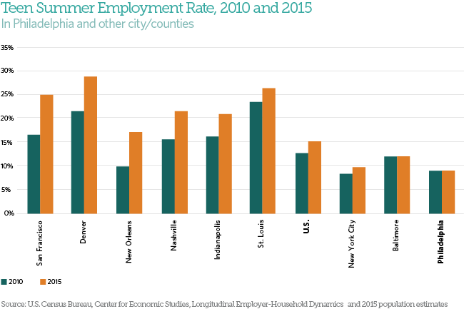 In most of these city/counties, the teenage employment rates increased from 2010 to 2015, in some cases by substantial amounts. Philadelphia’s rate remained flat. (See Figure 3.)