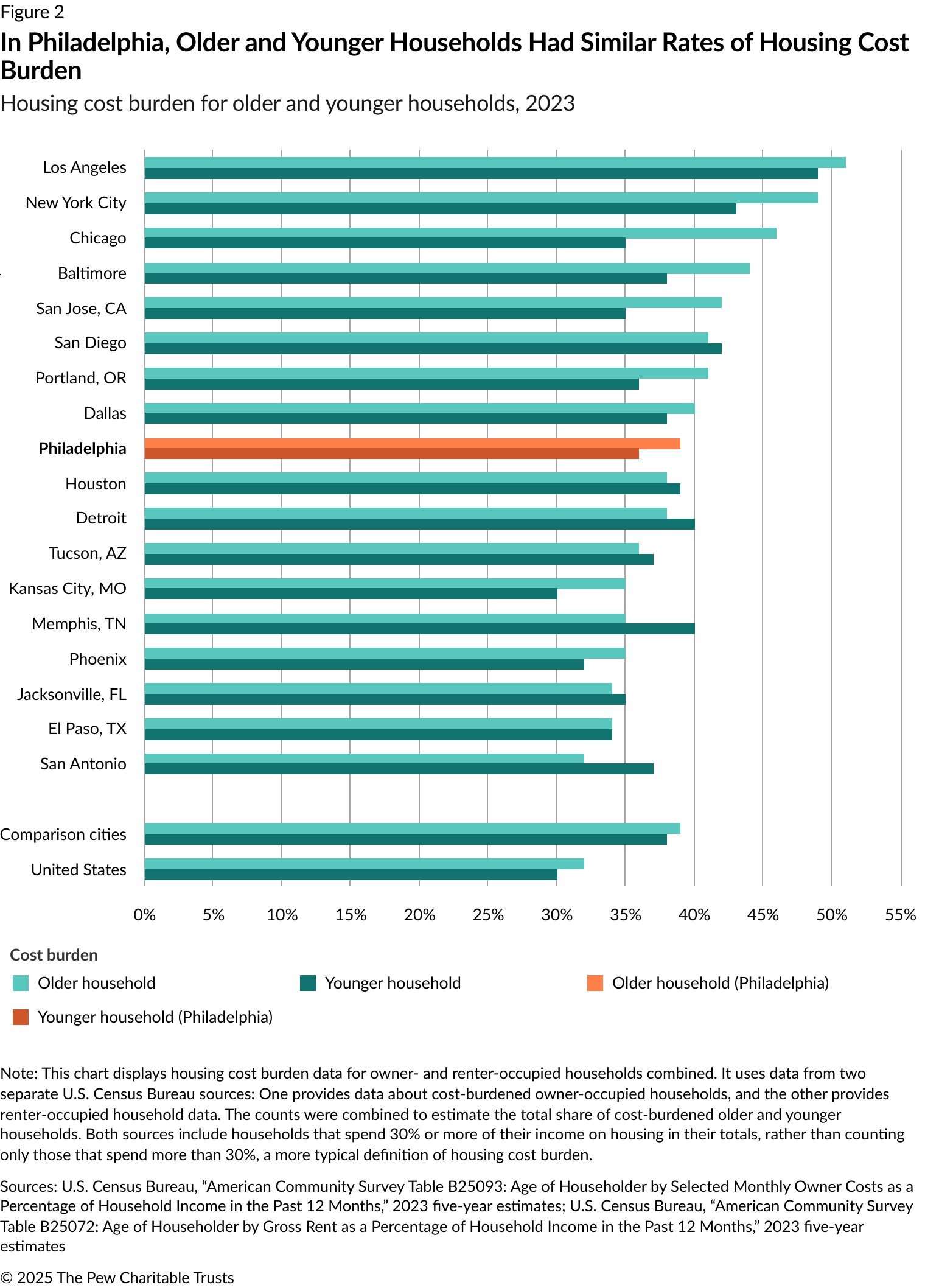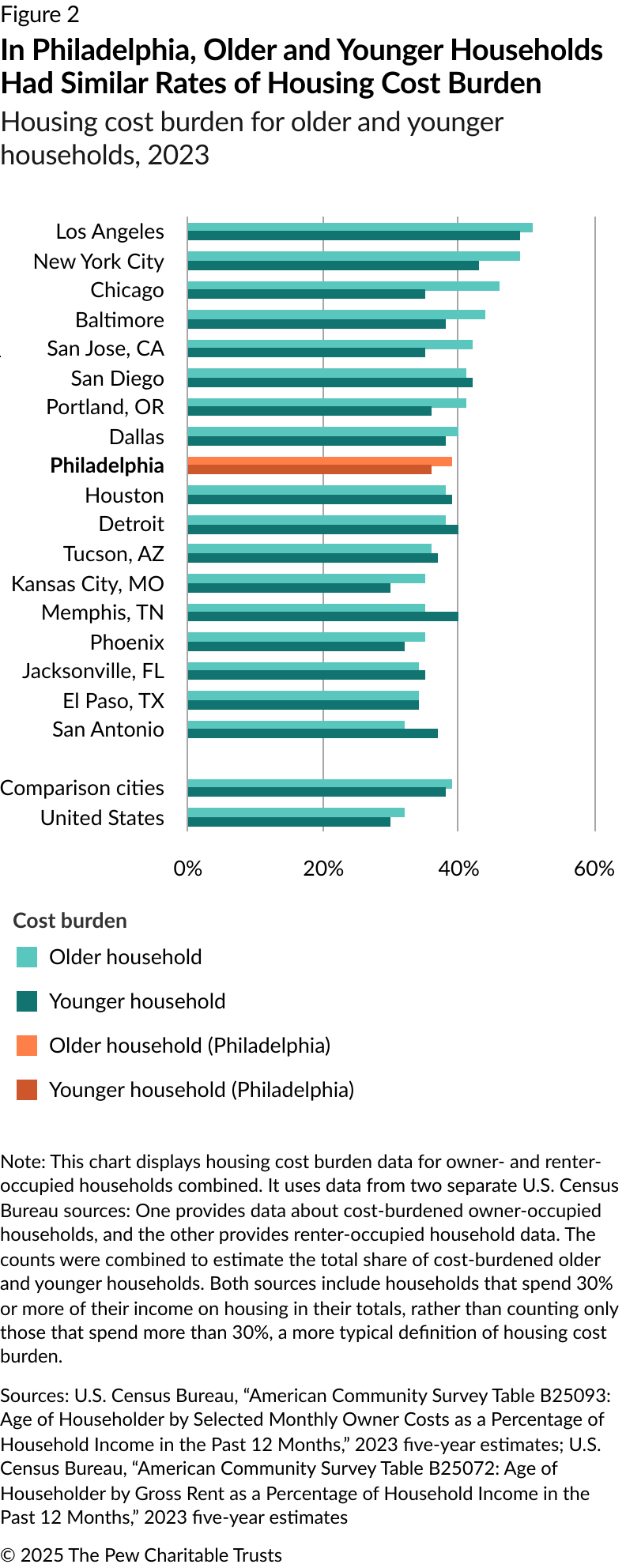 The proportion of older households that were housing cost-burdened in 2023 ranged from a low of 32% in San Antonio to a high of 51% in Los Angeles. At 39%, Philadelphia’s share of cost-burdened older households was exactly average among the 18 comparison cities. But nationwide, a smaller percentage of older households (32%) were cost-burdened, the result of high housing costs in U.S. cities compared with other areas. (See Figure 2.)