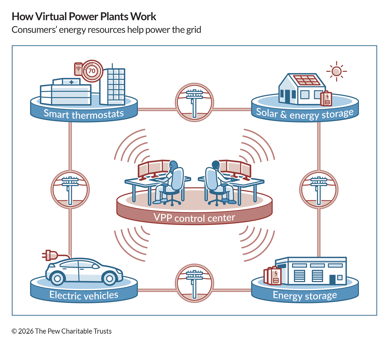 One emerging solution could provide some relief. Virtual power plants (VPPs) can play a key role in providing reliable and affordable power on demand in seconds. VPPs are an aggregation of distributed energy resources (DERs)—energy solutions such as solar and battery systems, smart thermostats, and electric vehicles installed at or close to homes and businesses—that can help balance electricity demand and supply.