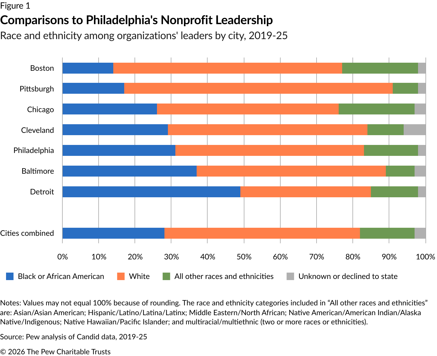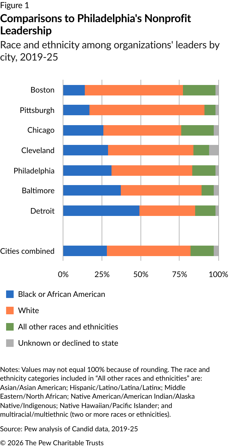 This analysis aims to provide factual information on the demographics of nonprofit leaders in the city, using data from Candid, an organization that collects and disseminates information about nonprofits. Pew used Candid's data about Philadelphia and six peer U.S. cities, in addition to using Candid’s nonprofit demographic data. The comparison cities analyzed—Baltimore, Boston, Chicago, Cleveland, Detroit, and Pittsburgh—were selected because they are frequently cited in Pew’s Philadelphia research, including in its annual “State of the City” report.