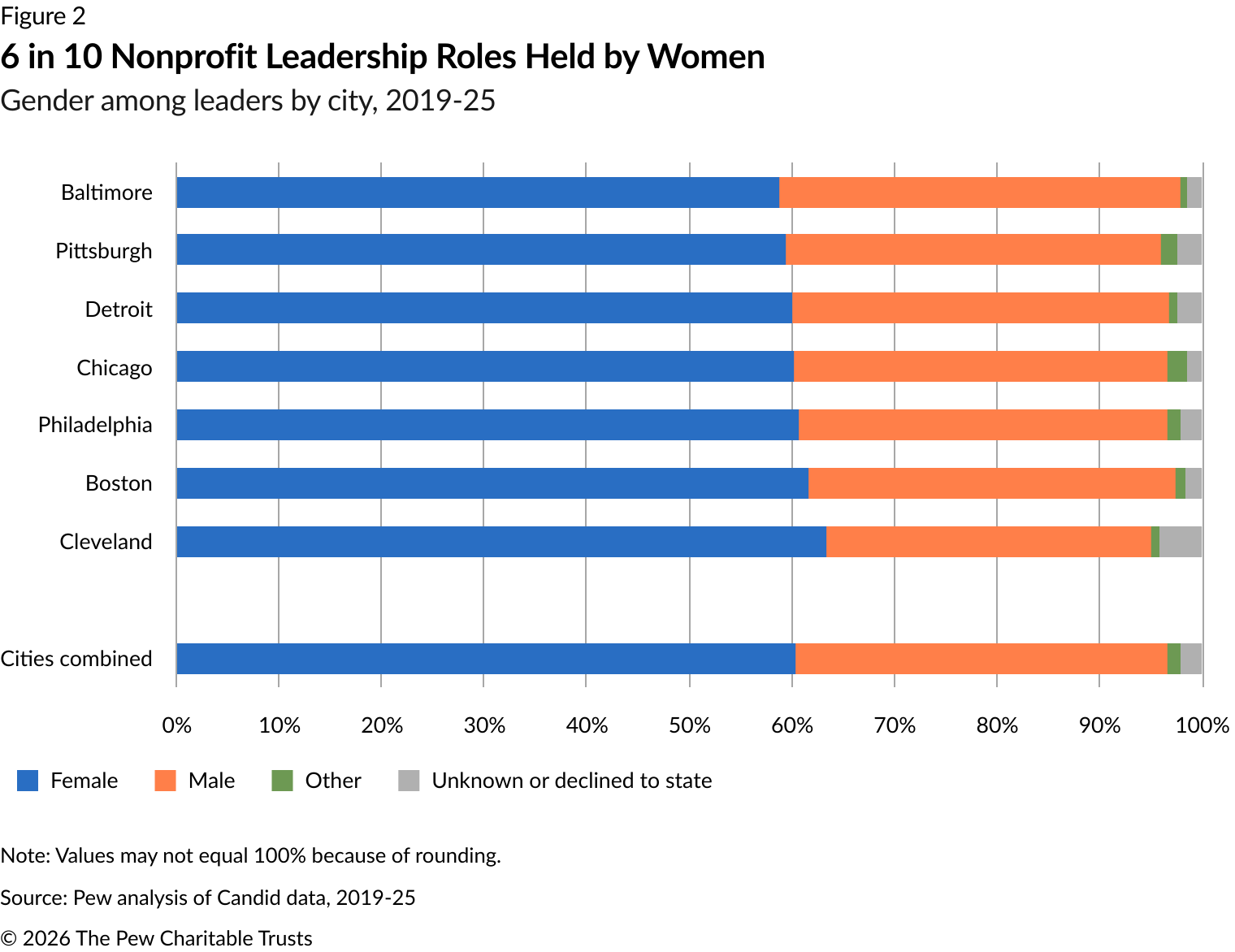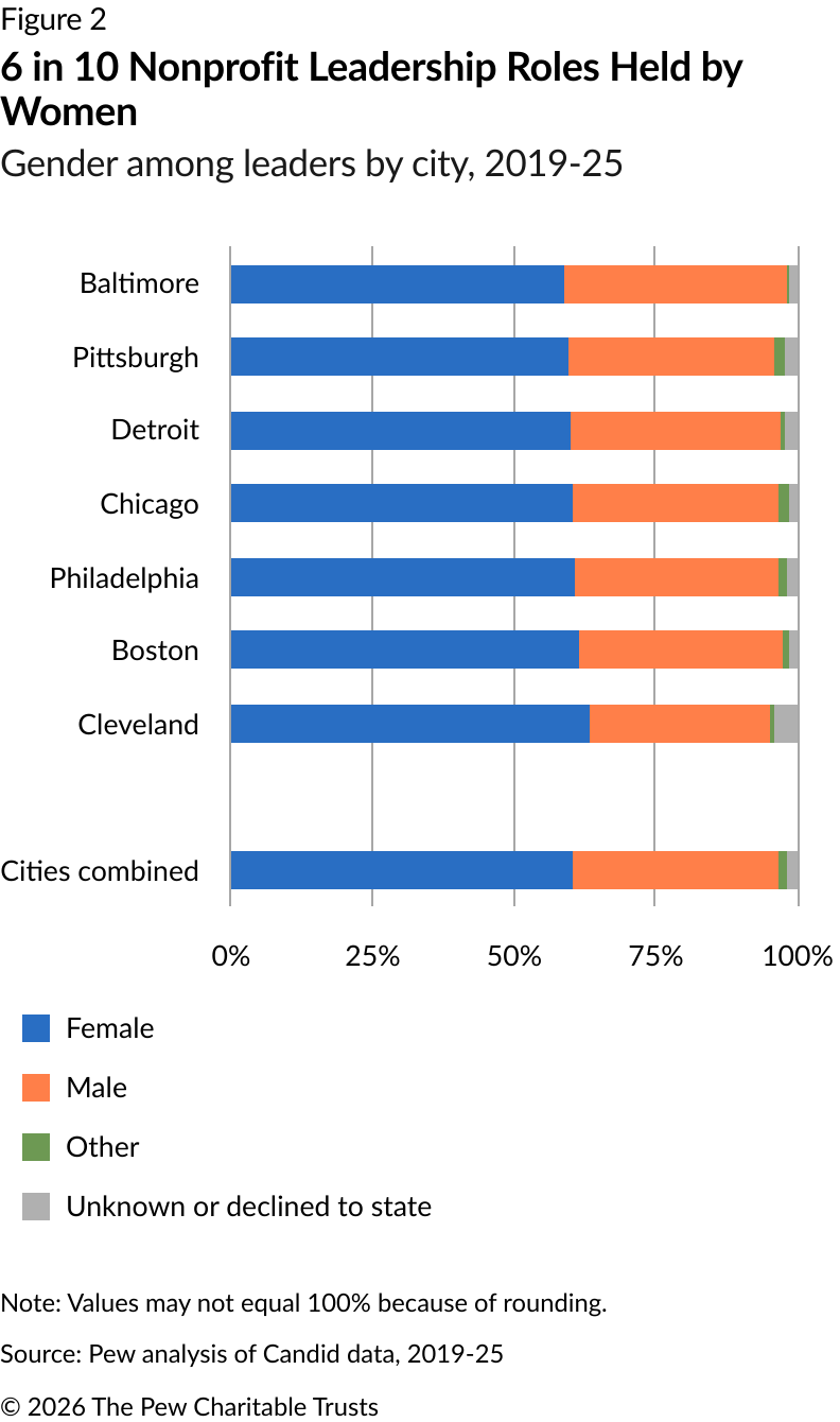 In all of the cities analyzed, roughly 60% of nonprofit leaders were women. Baltimore had the lowest share of female leaders at nonprofits, at 59%, and Cleveland was highest, at 63%. In Philadelphia, the share was 61%. (See Figure 2.) By comparison, previous Pew research on private business ownership found that the rate of female ownership among all businesses citywide was 42%.