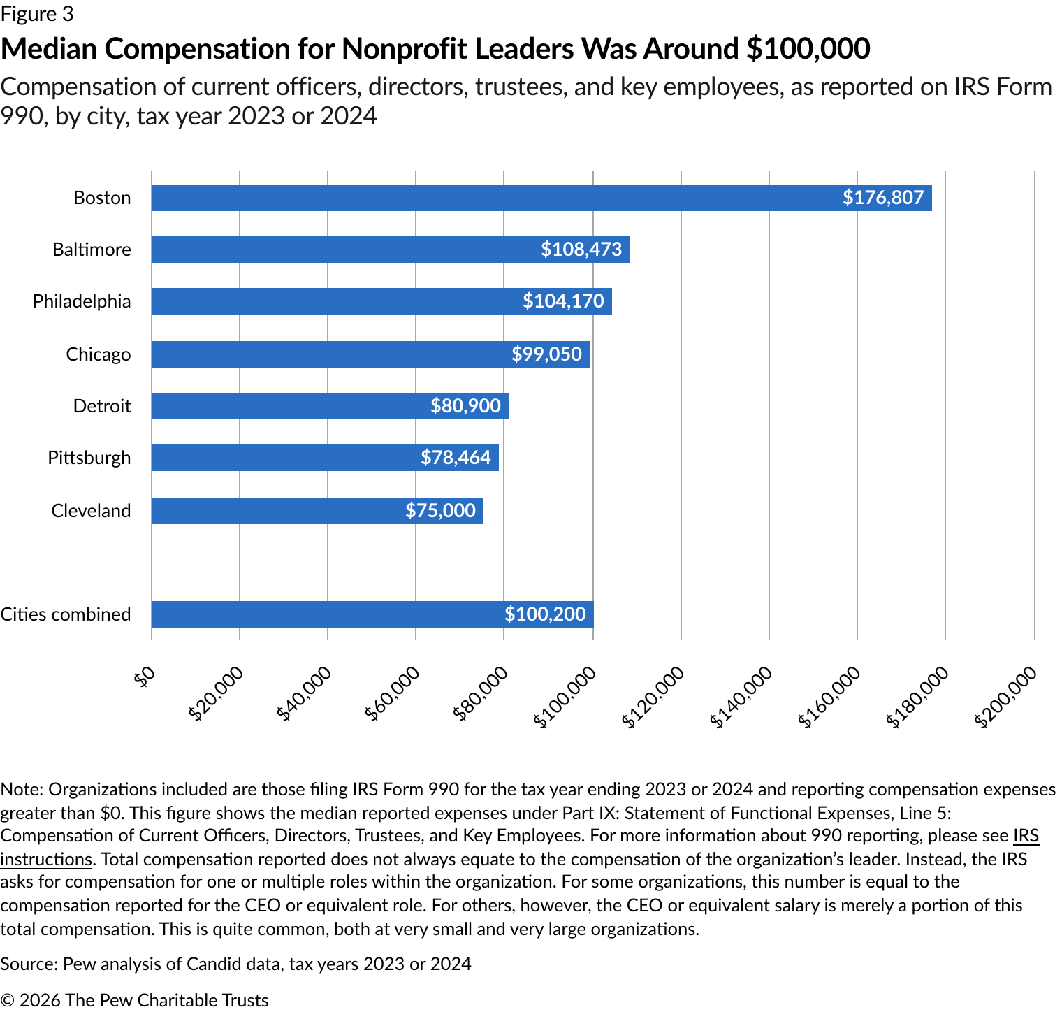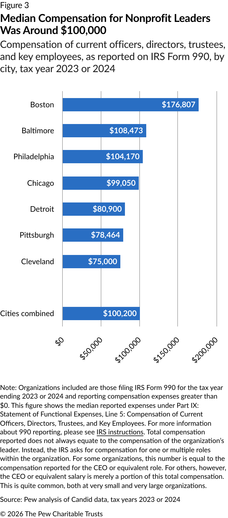 When considering leadership broadly (i.e., not solely the executive director or equivalent), nonprofits filing IRS form 990 must report total compensation for top staff, including “current officers, directors, trustees, and key employees.” In this section of Pew’s analysis, the reporting is referred to as “leadership compensation,” although the expense reported on this line may be associated with multiple high-level employees of an organization, rather than only the compensation of an executive director or equivalent role.