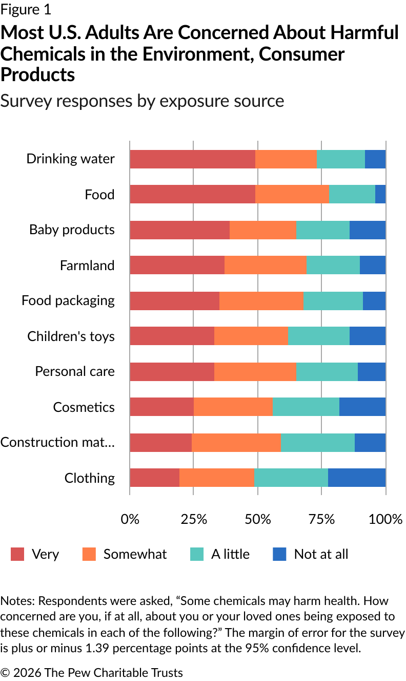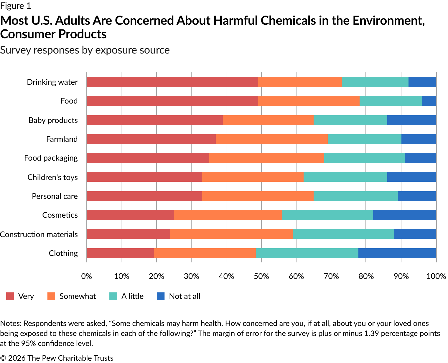 More than 70% of adults in the United States are very or somewhat concerned about their own or their loved ones’ exposure to harmful chemicals in food and drinking water, and a majority is also concerned about chemicals in food packaging, children’s and baby products, farmland, and other sources. (See Figure 1.) Further, about 5 in 6 want government and business to do more to ensure chemical safety and increase transparency around the use of chemicals.