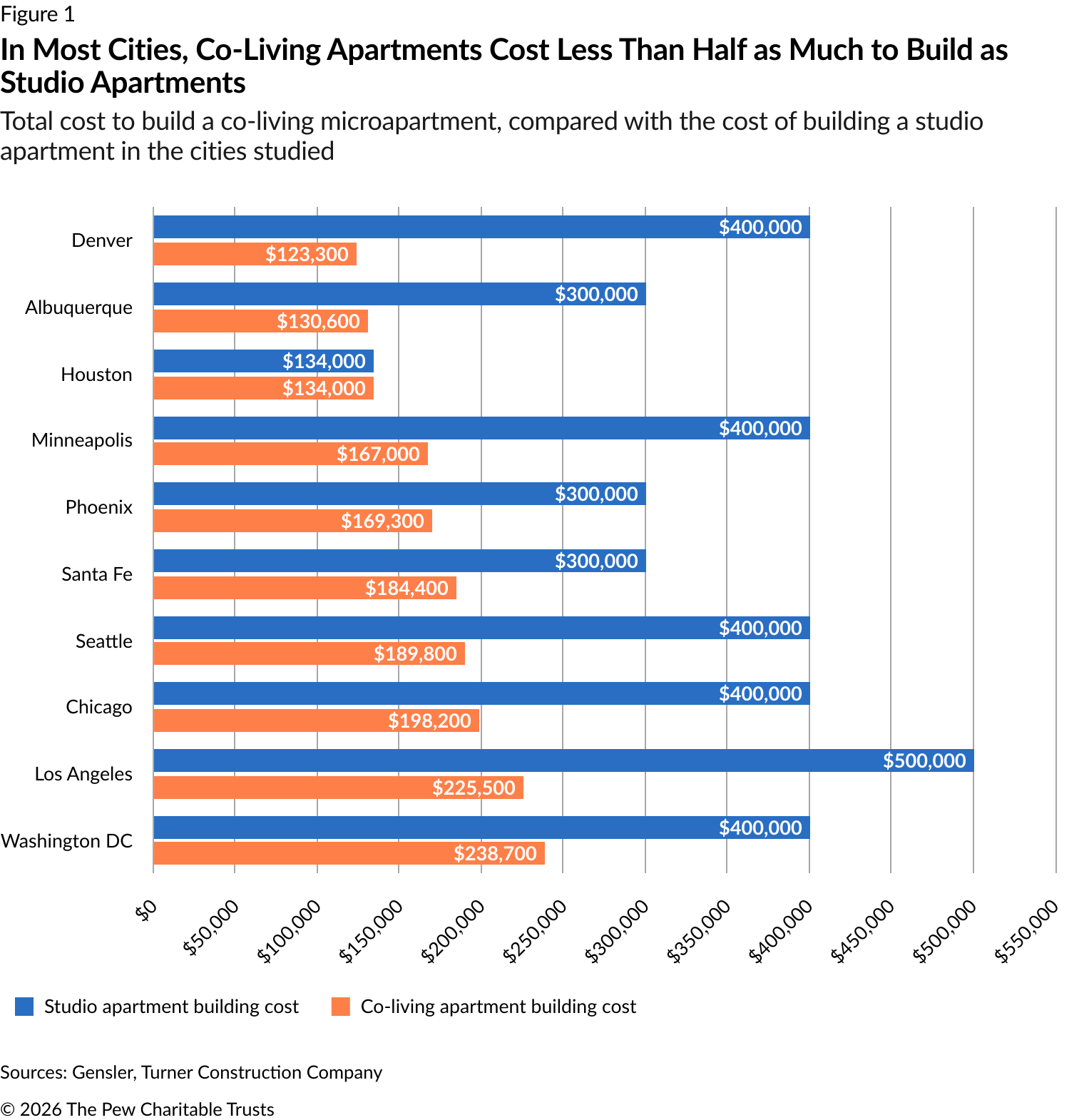Working with Turner Construction Company, Gensler found that small co-living apartments could be developed for $123,300 to $238,700 each, including acquisition, design, construction, furnishing, and, where needed, seismic retrofitting. In all but one city—Houston—costs ranged from one-third to half the price of developing new traditional studio apartments, which often run $400,000 each in large, high-cost cities.