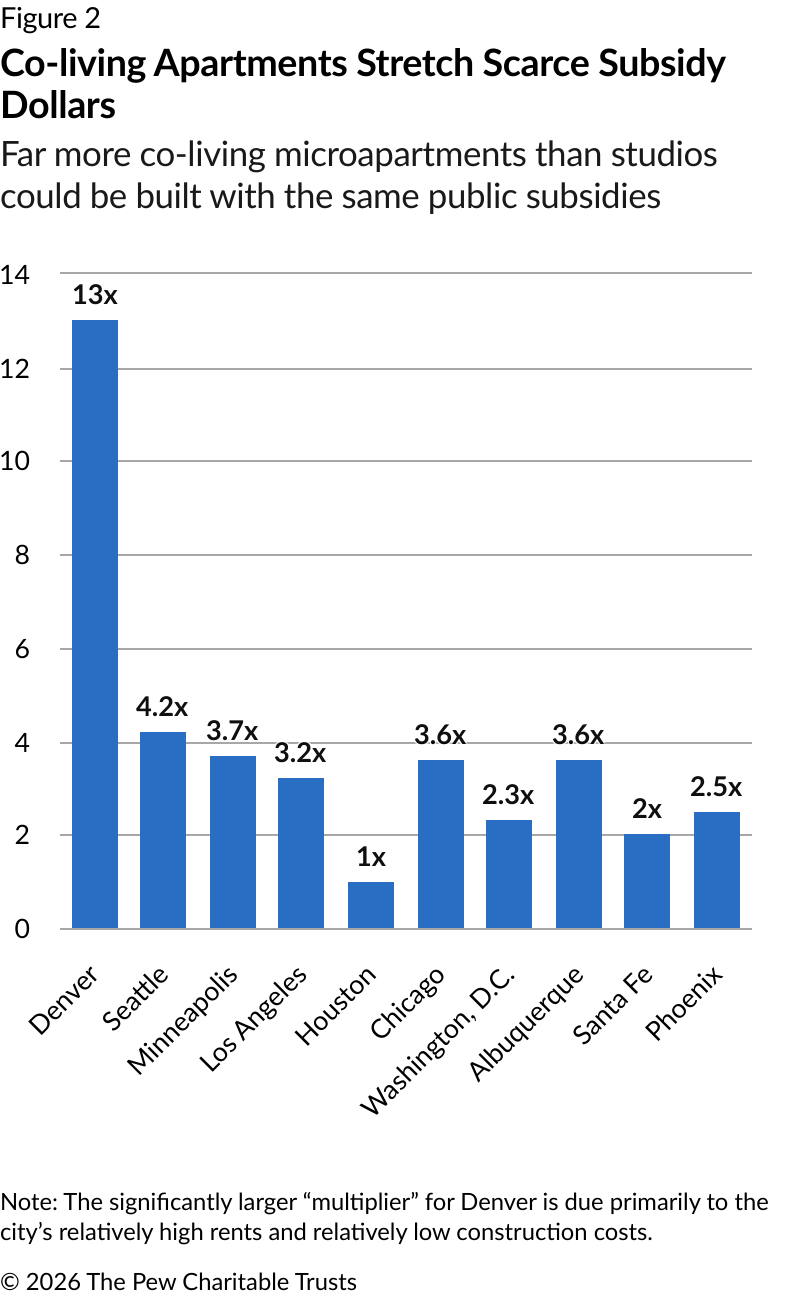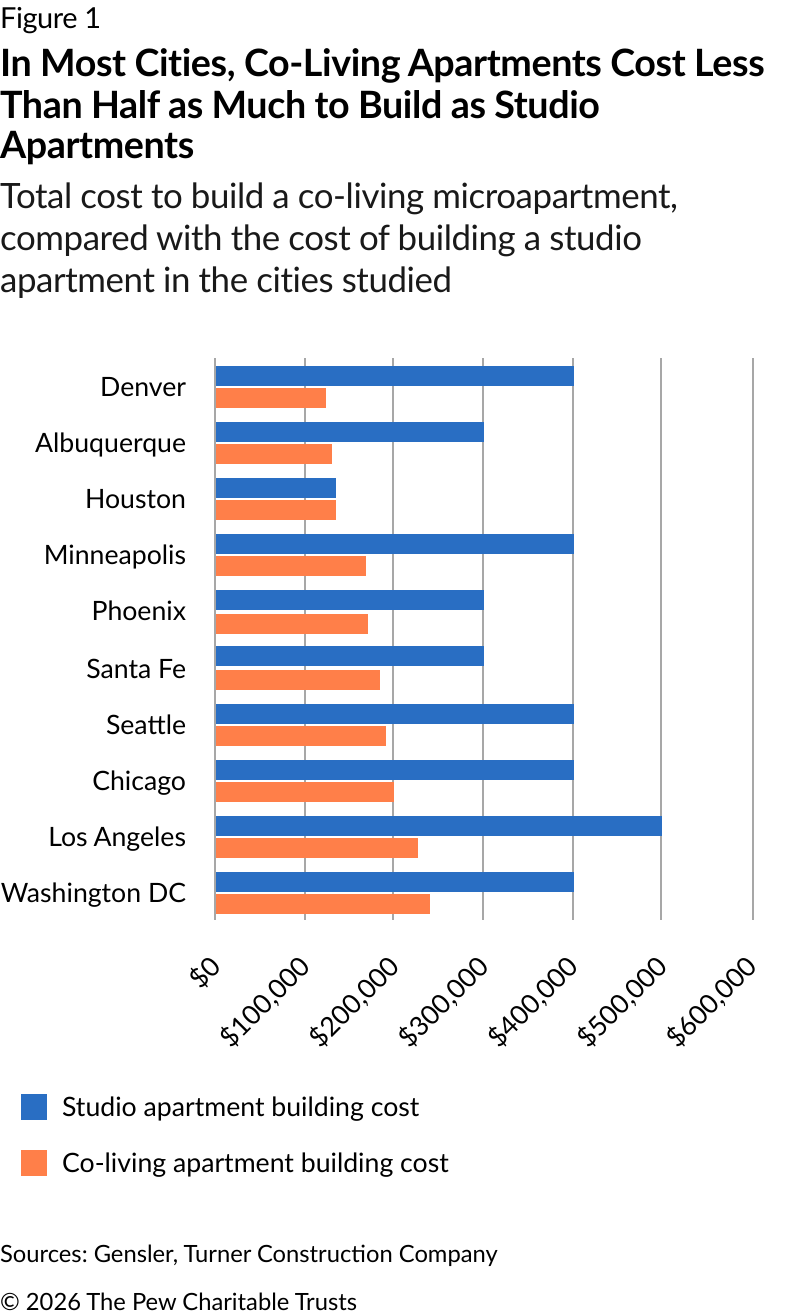 Throughout 2025, The Pew Charitable Trusts collaborated with Gensler, a global architecture, design, and planning firm, to explore the feasibility of transforming vacant office buildings into co-living microapartments in 10 U.S. cities: Denver; Minneapolis; Seattle; Los Angeles; Houston; Chicago; Washington, D.C.; Albuquerque and Santa Fe, New Mexico; and Phoenix. This emerging model takes its cues from single-room occupancy (SRO) dwellings that once provided flexible, extremely low-cost housing before they were largely zoned out of existence. Research estimates that more than 1 million SRO apartments were destroyed or converted to other uses from 1970 to 1980 alone. Their demise was a major factor in driving up homelessness.