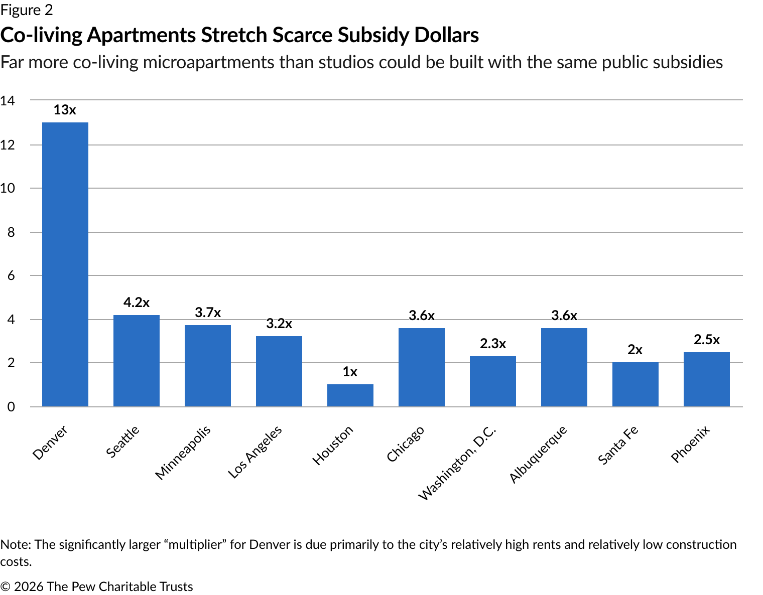 This relatively low subsidy means that every dollar of public investment would produce far more housing with the co-living model than a traditional apartment project. In Phoenix, for example, a $25 million subsidy would produce 294 co-living apartments, compared with only 116 studio apartments—roughly 2.5 times as many homes for the same public investment. In Seattle, the “multiplier” would be 4.2; in Chicago, 3.6.