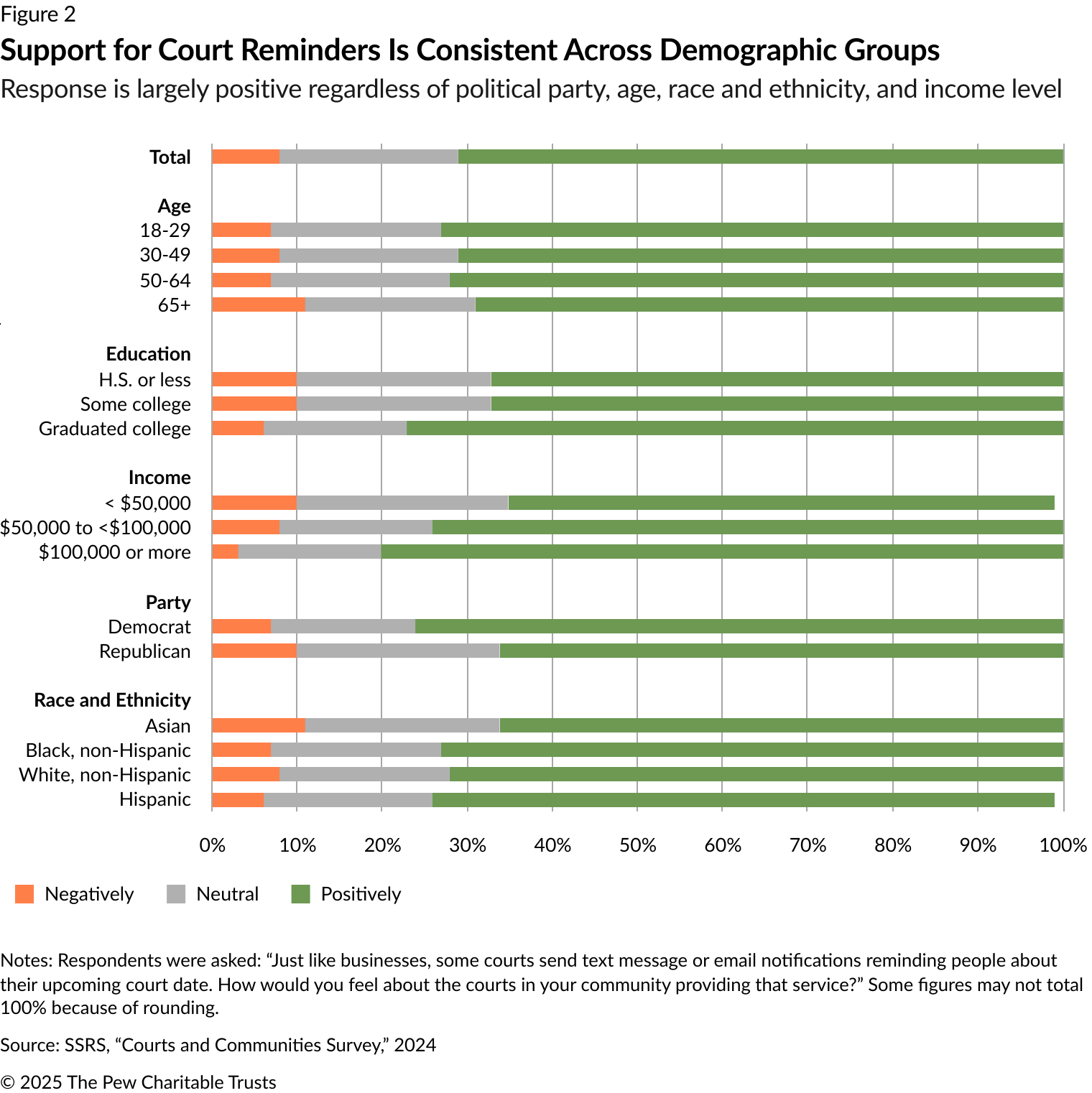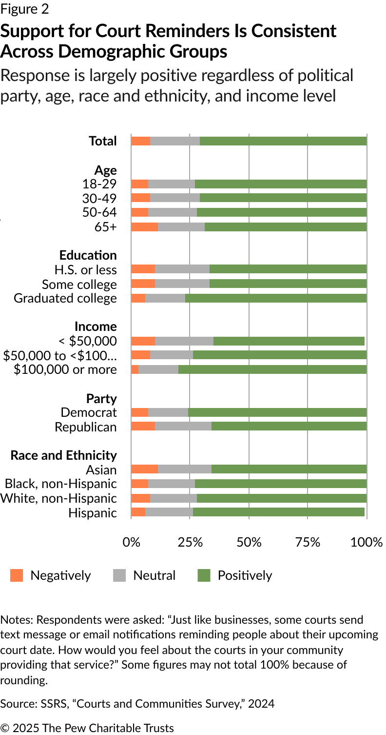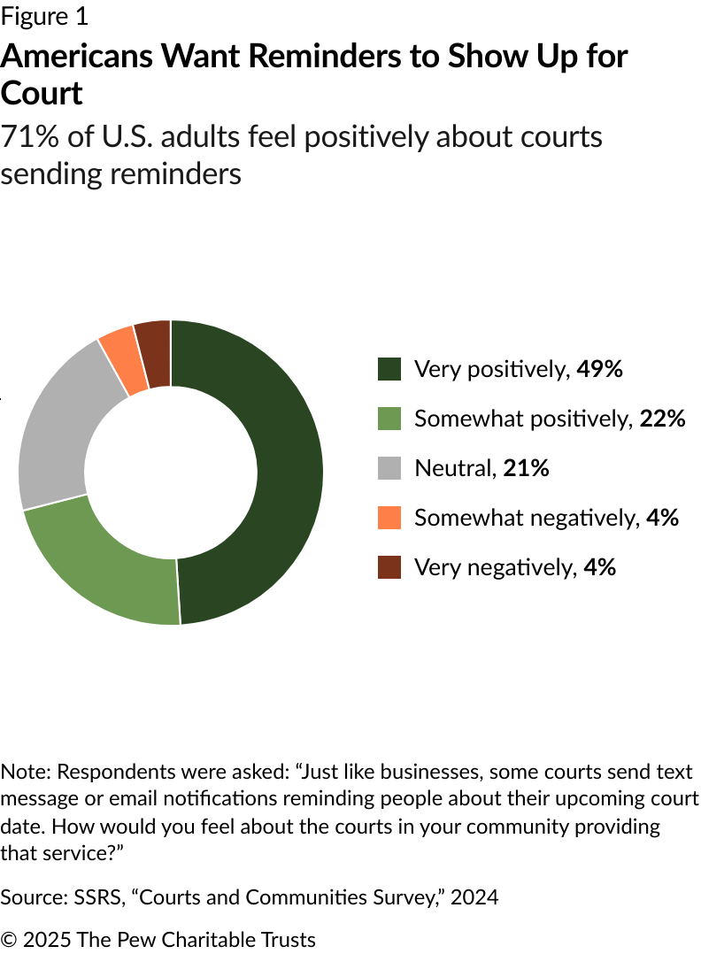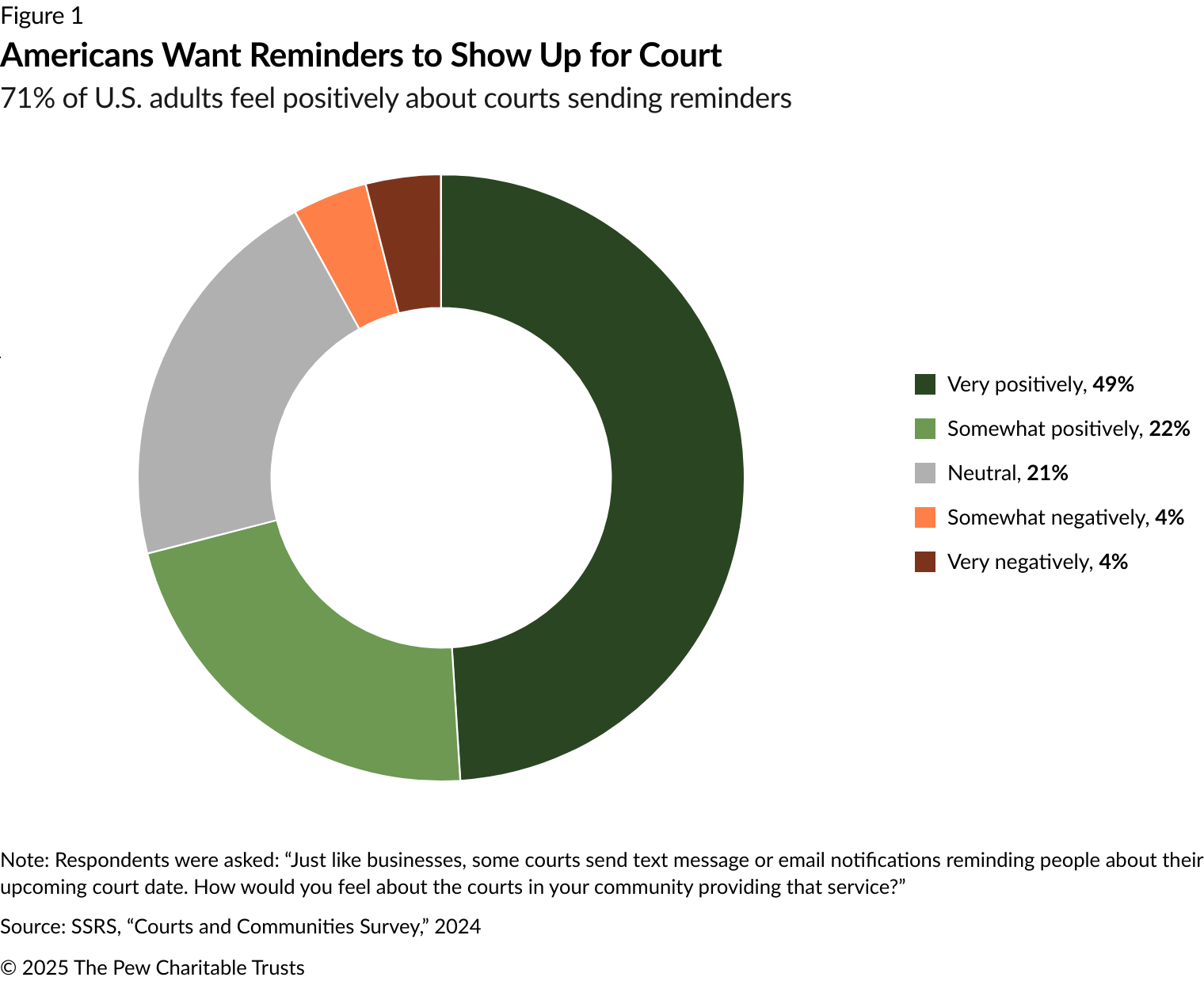 According to a national poll released by The Pew Charitable Trusts in August 2025, more than 7 in 10 U.S. adults (71%) have positive feelings about courts providing court date reminders to people in advance of their hearings. The poll suggests that about 1 in 5 U.S. adults (21%) are neutral about reminders, and just 8% have a negative response.
