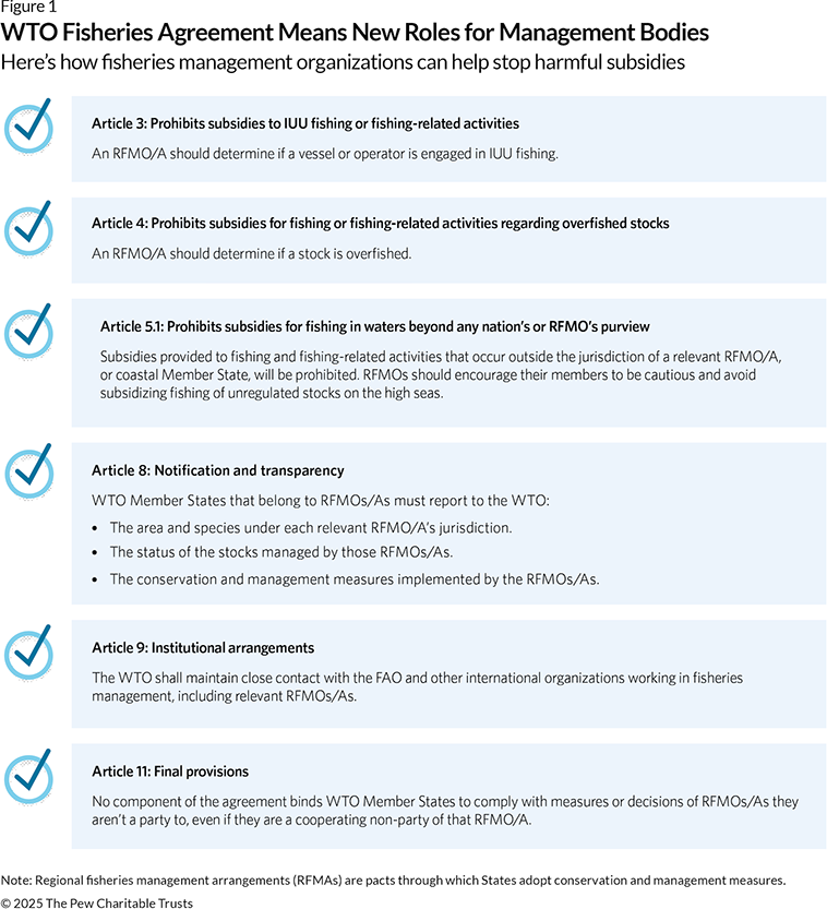 RFMOs are responsible for the conservation and management of the world’s most valuable commercial fish stocks, such as tuna. These international bodies are composed of member governments that share a practical or financial interest in managing and conserving fish stocks – for example, coastal countries that fish in or near the RFMO’s area and countries that import that fishery’s products. RFMOs are critical to helping operationalize the Agreement on Fisheries Subsidies (see Figure 1). RFMOs can require monitoring, control and surveillance of fishing and fishing vessels in their waters and thus could help governments provide the WTO with detailed information on precisely what fishing is being subsidized in those areas. This could include information on the status of the fish stock, any conservation or management measures in place, and catch data.