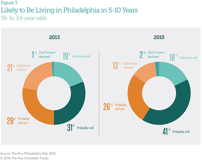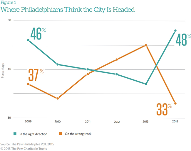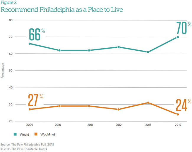 Nearly half of residents surveyed said Philadelphia is heading in the right direction, while a third said it is on the wrong track. Sixty-seven percent expect the city to improve in the next five years, while 18 percent expect it to get worse. Three times as many residents would recommend Philadelphia to a friend as a place to live as would not. And young adults see themselves as more likely to build their futures in the city than in the last Pew Philadelphia Poll, which was taken in the summer of 2013.