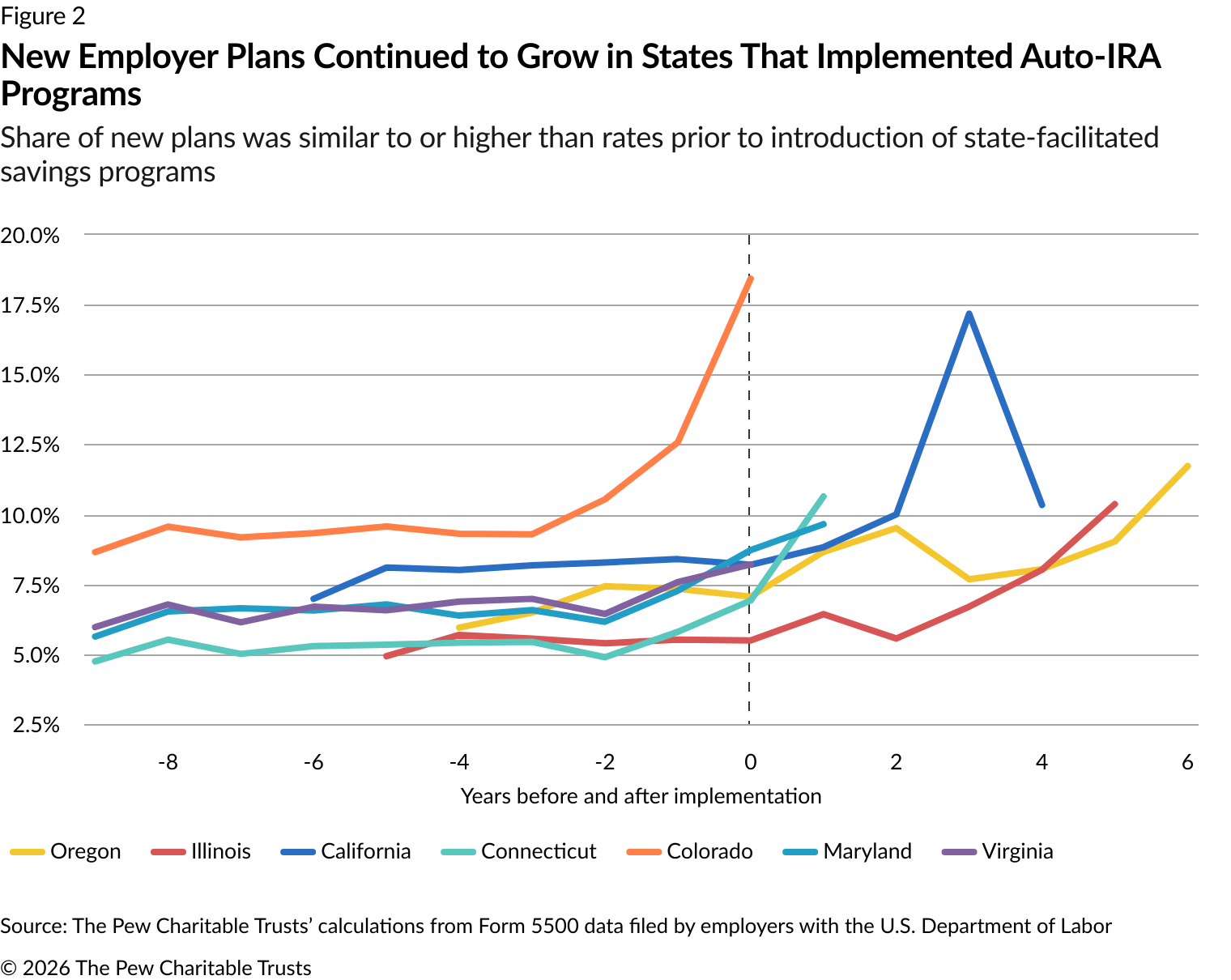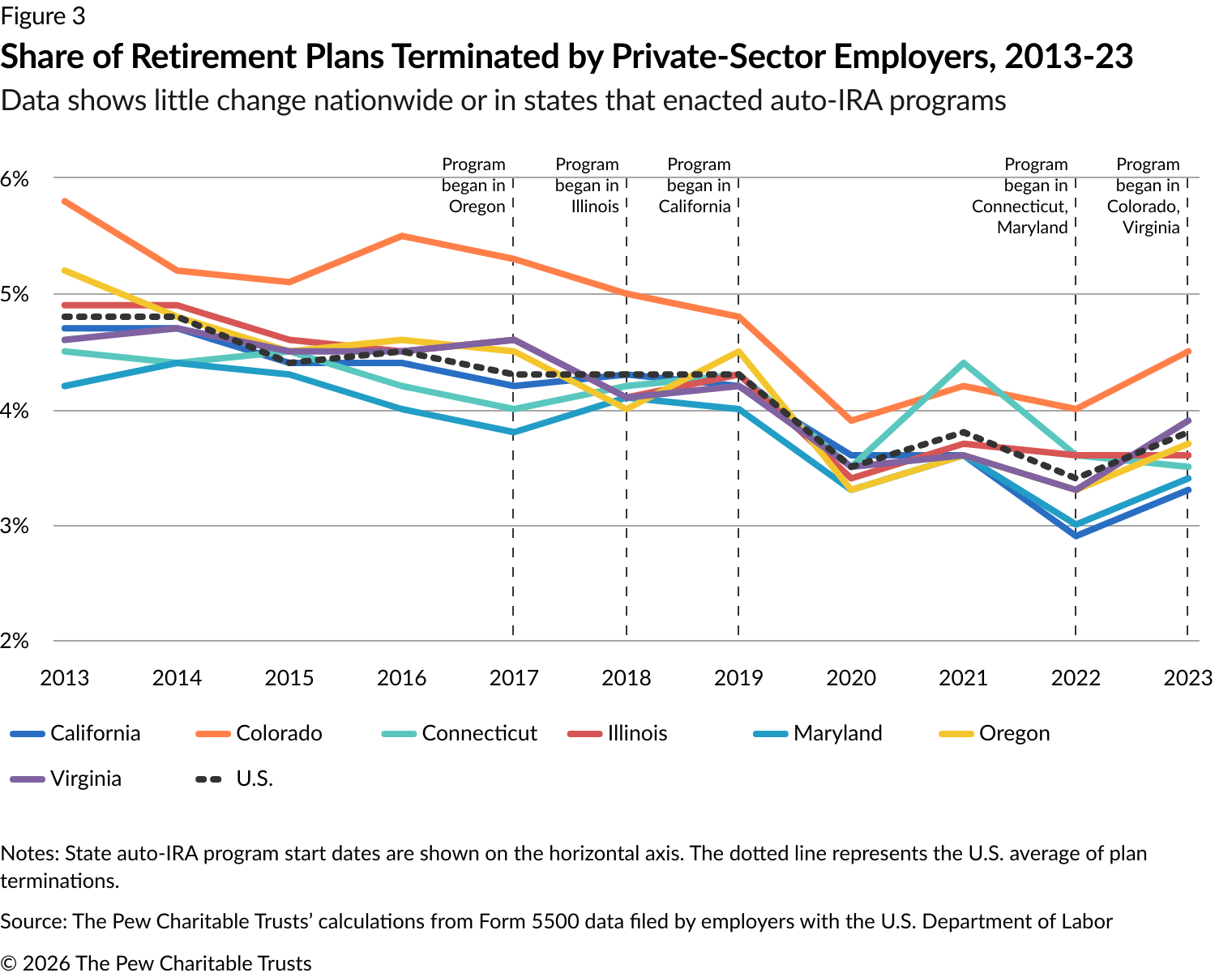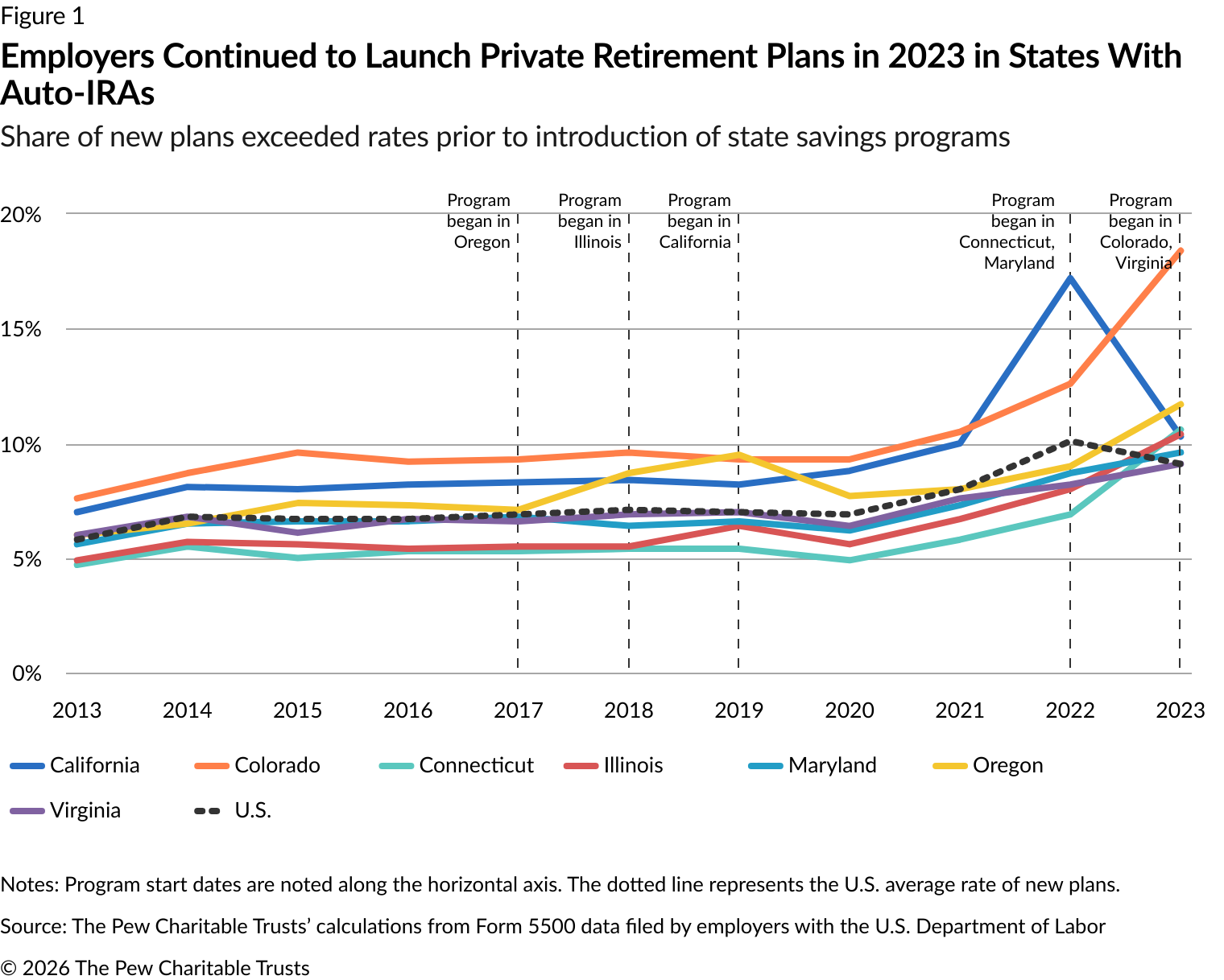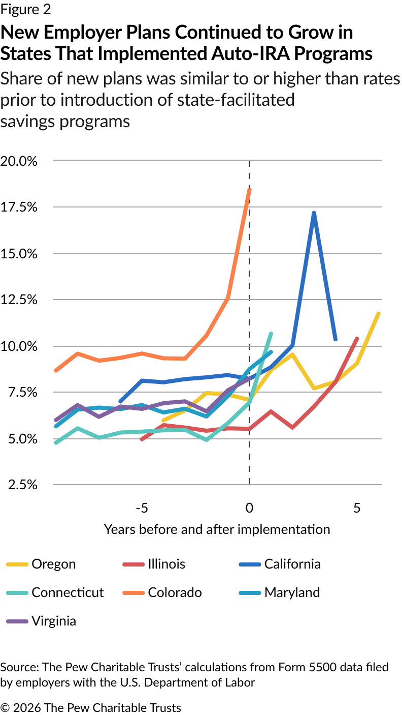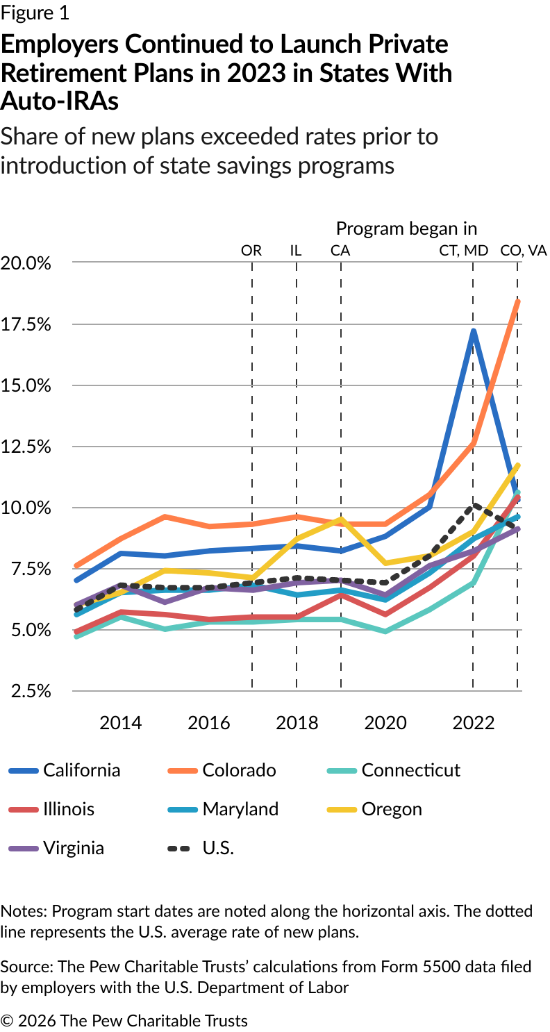 The Pew Charitable Trusts has been tracking the formation of private-sector retirement plans since 2021. Pew initially examined data from annual filings by employer-sponsored retirement plans to the U.S. Department of Labor from 2013 to 2019.3 That analysis suggested that, in states with auto-IRA programs, employers with retirement plans continued to offer them, and businesses without plans were adopting new ones at rates similar to those before the state options became available.