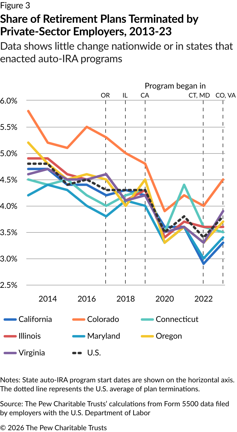 To fully understand the effect of state-facilitated auto-IRA programs on private employer retirement plans, Pew looked at whether and how often employers terminated retirement plans because the state auto-IRA became an option. As shown in Figure 3, the rate of plan terminations nationwide rose by 0.4 percentage points between 2022 and 2023 (from 3.4% of plans to 3.8%). Terminations also rose in five states with automated savings programs (California, Colorado, Maryland, Oregon, and Virginia). Still, terminations in these states were generally in line with the national trend, rising between 0.4 and 0.6 percentage points; Connecticut and Illinois were exceptions, with both recording similar rates of termination in 2022 and 2023. Colorado was the only state with an auto-IRA program that had a private plan termination rate that significantly exceeded the national average in 2023; it has been above the national average every year since 2013. These results show that employers in states with auto-IRA programs are not canceling their retirement plans at higher rates than the national average.