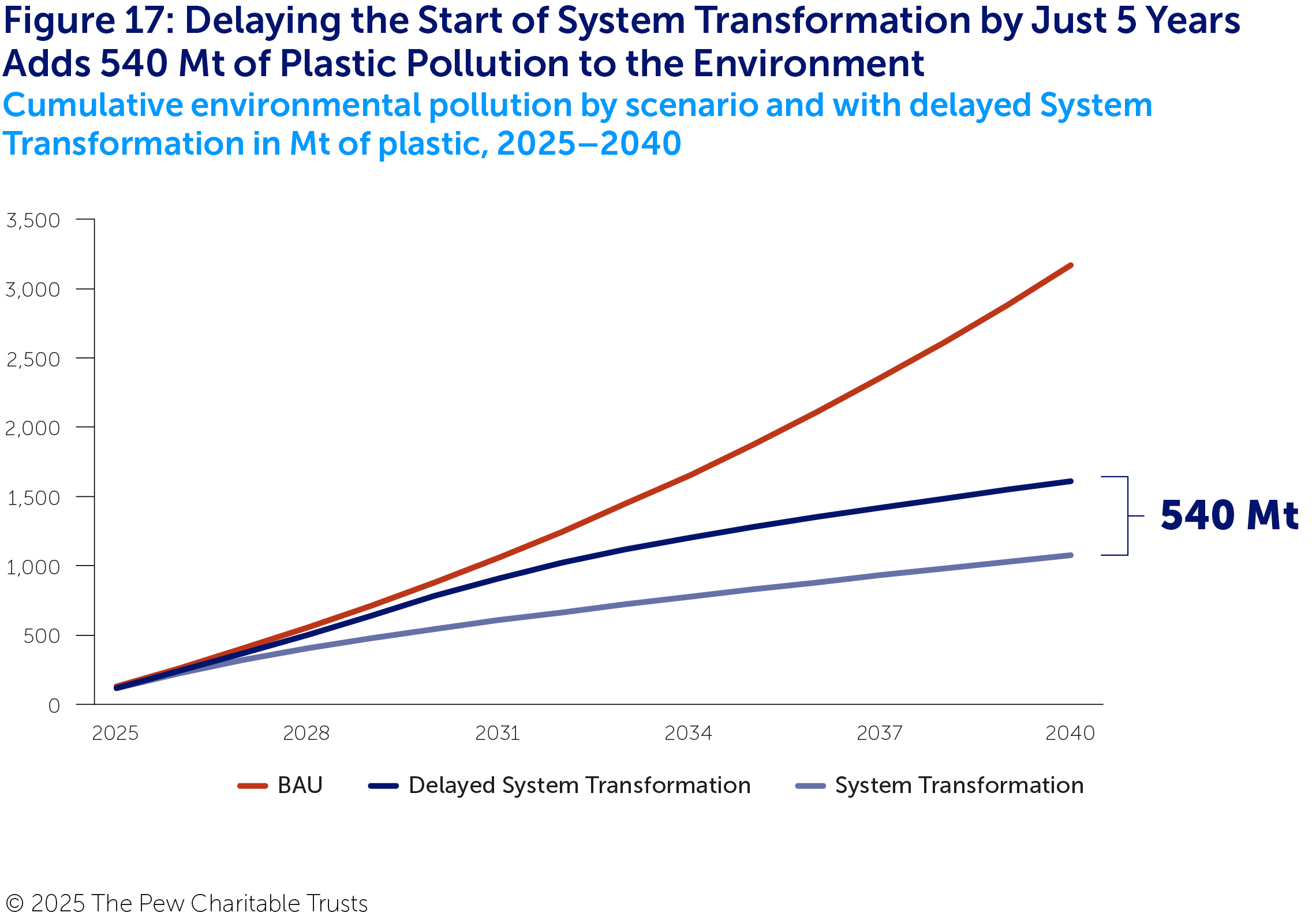 9. Delay is costly. Waiting just five years to initiate System Transformation would result in 1,100 Mt more primary plastic being produced, 540 Mt more plastic entering the environment and 5.3 GtCO2e more GHG emissions between 2025 and 2040. A five-year delay would increase governments’ annual costs for plastic collection and disposal by an estimated 23% annually (US$27 billion) and add US$6.1 billion in annual capital expenditures by 2040 for open-loop mechanical recycling and incineration capacity for plastic alone. But these technologies also would be at growing risk of obsolescence as the economy becomes more circular. So this same five-year delay could lead to overinvestment in solutions that do not align with the future plastic system and, in turn, sizeable financial losses for companies and inefficient use of the limited public funding available for addressing the global plastic problem.