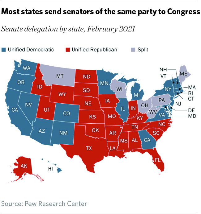 In another reflection of the partisan polarization that has reshaped American politics over the past few decades, states’ current Senate delegations are remarkably aligned with their presidential preferences.
