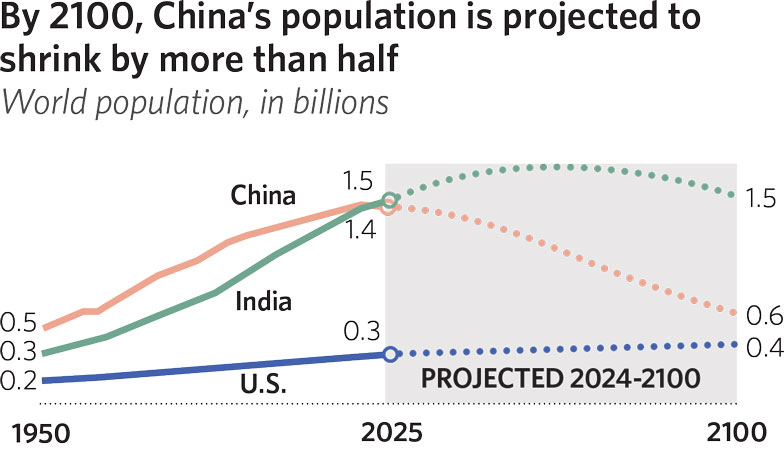 The world’s three most populous countries are expected to have different trajectories over the century: India is projected to peak at 1.7 billion people and then decline to 1.5 billion by 2100. China’s population is expected to drop to 633 million. The U.S. is expected to grow slowly and steadily to 421 million.