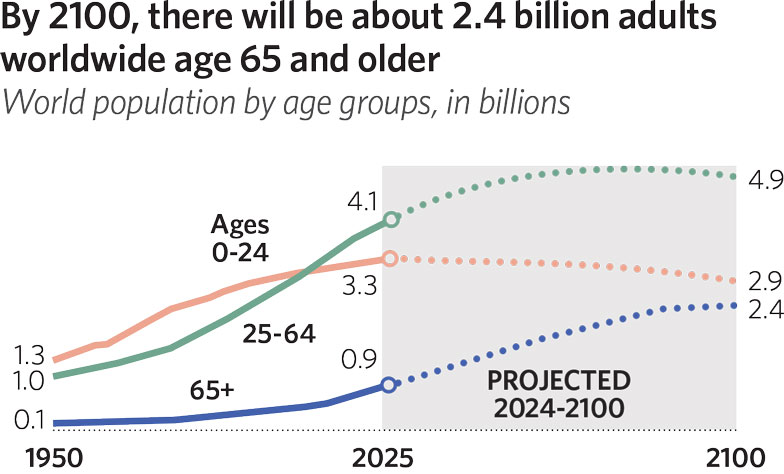 The world’s population is expected to get older. The world’s median age is projected to rise to 42 by 2100, up from 31 today and 22 in 1950.