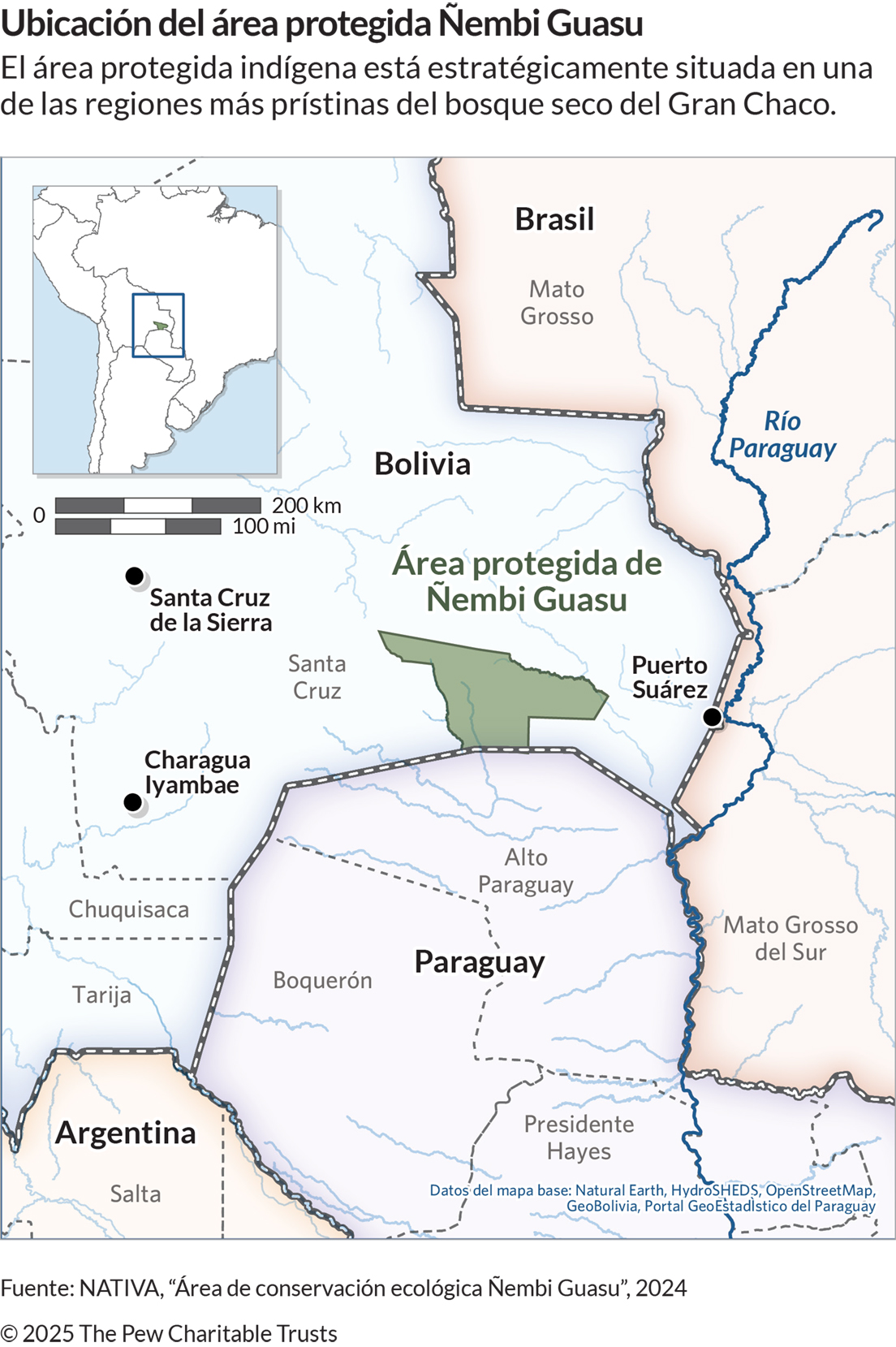 Ñembi Guasu significa “gran refugio” en guaraní. Esta zona protegida conecta el Gran Chaco, el bosque Chiquitano y el Pantanal, el mayor humedal tropical del mundo. Esta conectividad es fundamental para especies que requieren grandes extensiones de hábitat, como el jaguar y el tapir. El GAIOC administra Ñembi Guasu con el apoyo técnico y financiero de la Fundación local Nativa y de The Pew Charitable Trusts. El área se gestiona localmente y tanto el director como gran parte del personal son de ascendencia guaraní.