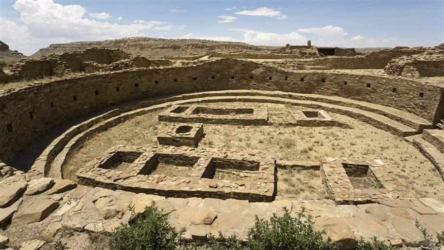 Visitors to Chaco Culture National Historical Park traverse a rocky, 20-mile roadway to reach its entrance and are rewarded with ancient, dun-colored ruins that blend into a quiet canyon. This setting was a thriving trade and political center for thousands of Chacoan people from A.D. 850-1250.