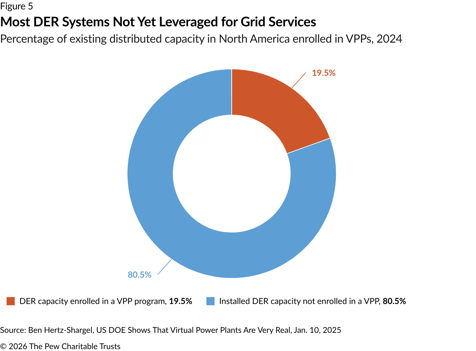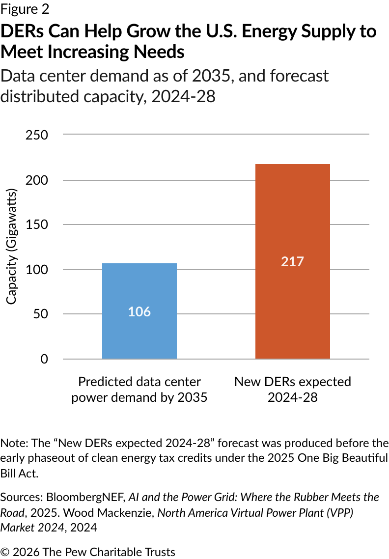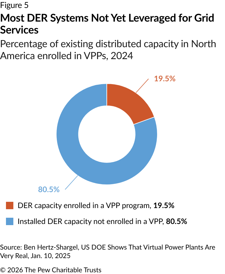 DERs provide a relatively small portion of U.S. electricity, particularly compared with their use in Australia and several European countries. However, that share is growing. Nearly 77% of U.S. households had smart electric meters in 2023 compared with 60% just five years before. Smart meters can be helpful in measuring and communicating about DER performance, particularly when the DER device cannot be directly metered.12 As of December 2025, 24 states and Washington, D.C., have policies that enable community solar-shared solar projects that give subscribing customers credits on their electricity bills.13 And as costs continue to decline, millions of homes and businesses are adding rooftop solar, batteries, and EVs each year.14
