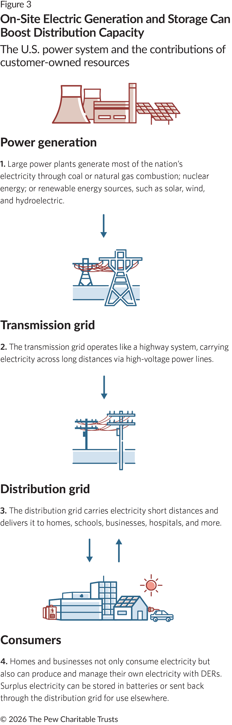 DERs are technologies that generate, store, or manage electricity close to where it is used, such as batteries, rooftop solar panels, community solar, managed electric vehicle charging, smart thermostats and appliances, and advanced building controls (systemwide automation that monitors and manages energy use in buildings). These technologies connect to the distribution system to help homes and businesses produce or control their electricity and to provide surplus power to the grid. (See Figure 3.)