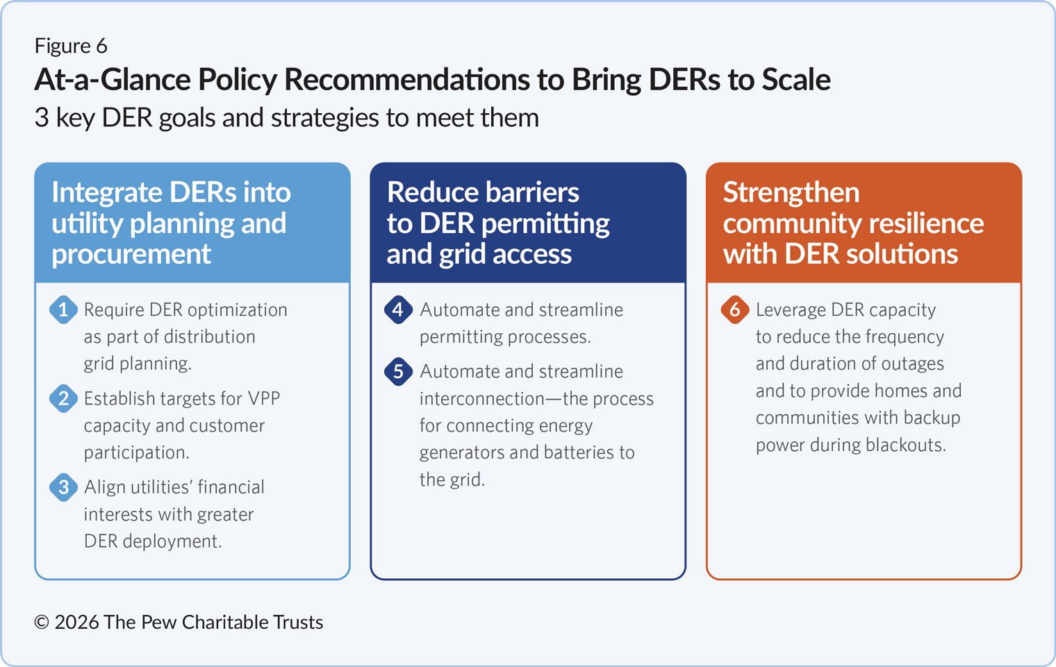 To help address this challenge, The Pew Charitable Trusts, with input and guidance from a wide range of practitioners in the field and an advisory council of experts representing diverse viewpoints, identified three core DER policy goals and specific recommendations that can help decision-makers, including state elected officials and public utility regulators, begin the work of bringing DERs to scale nationwide:
