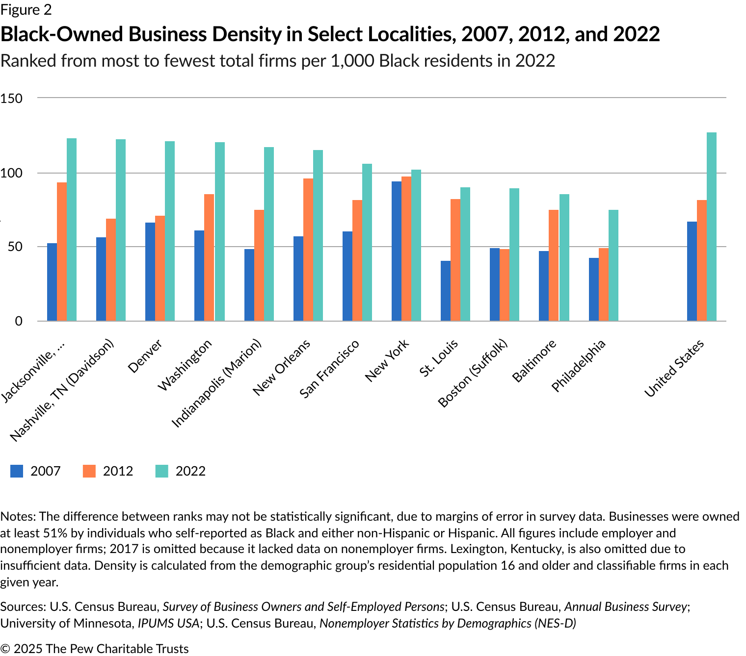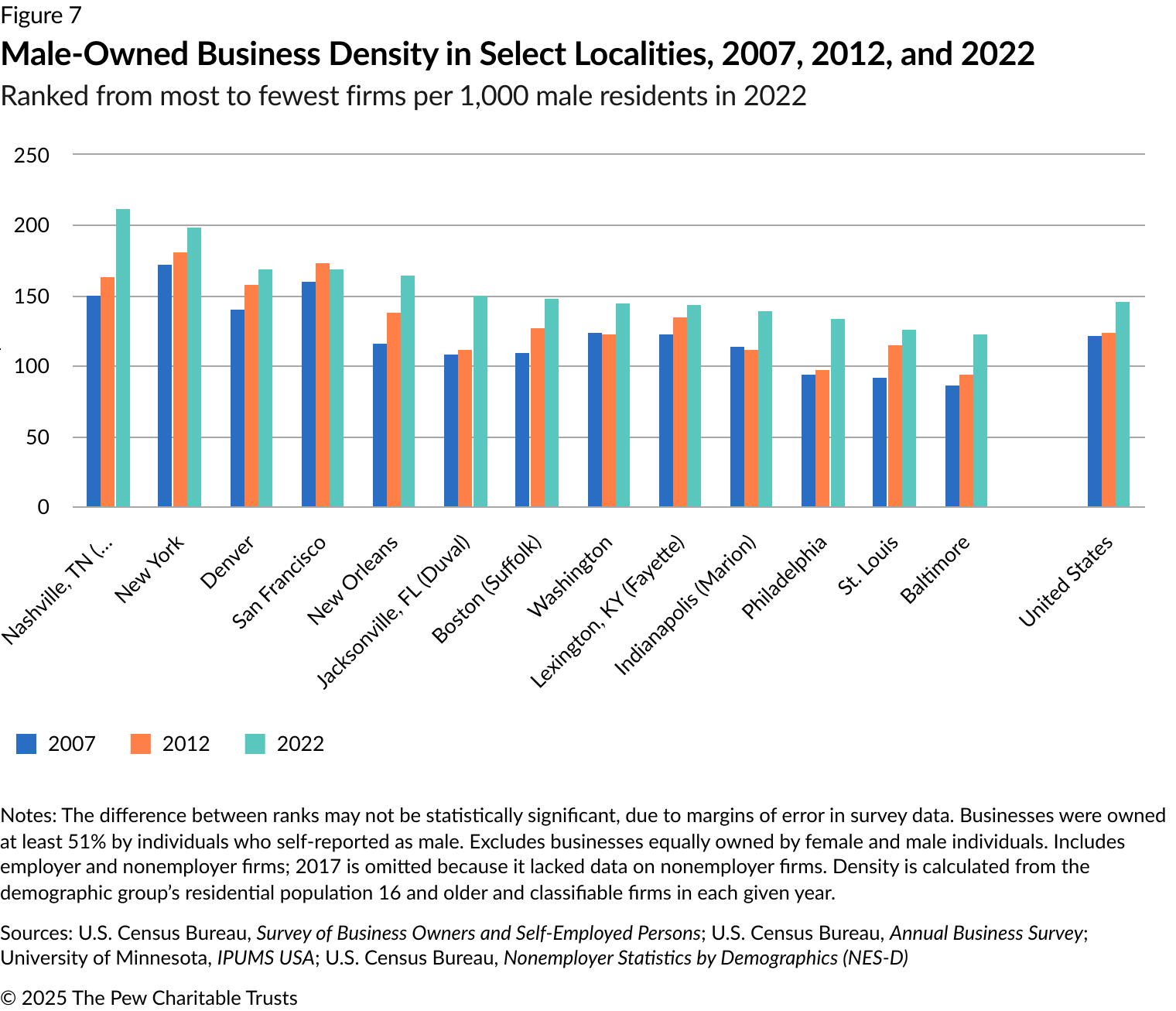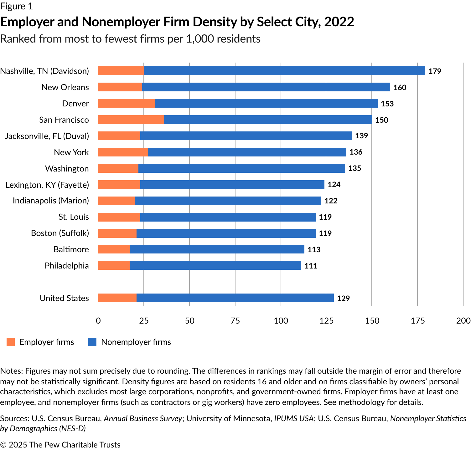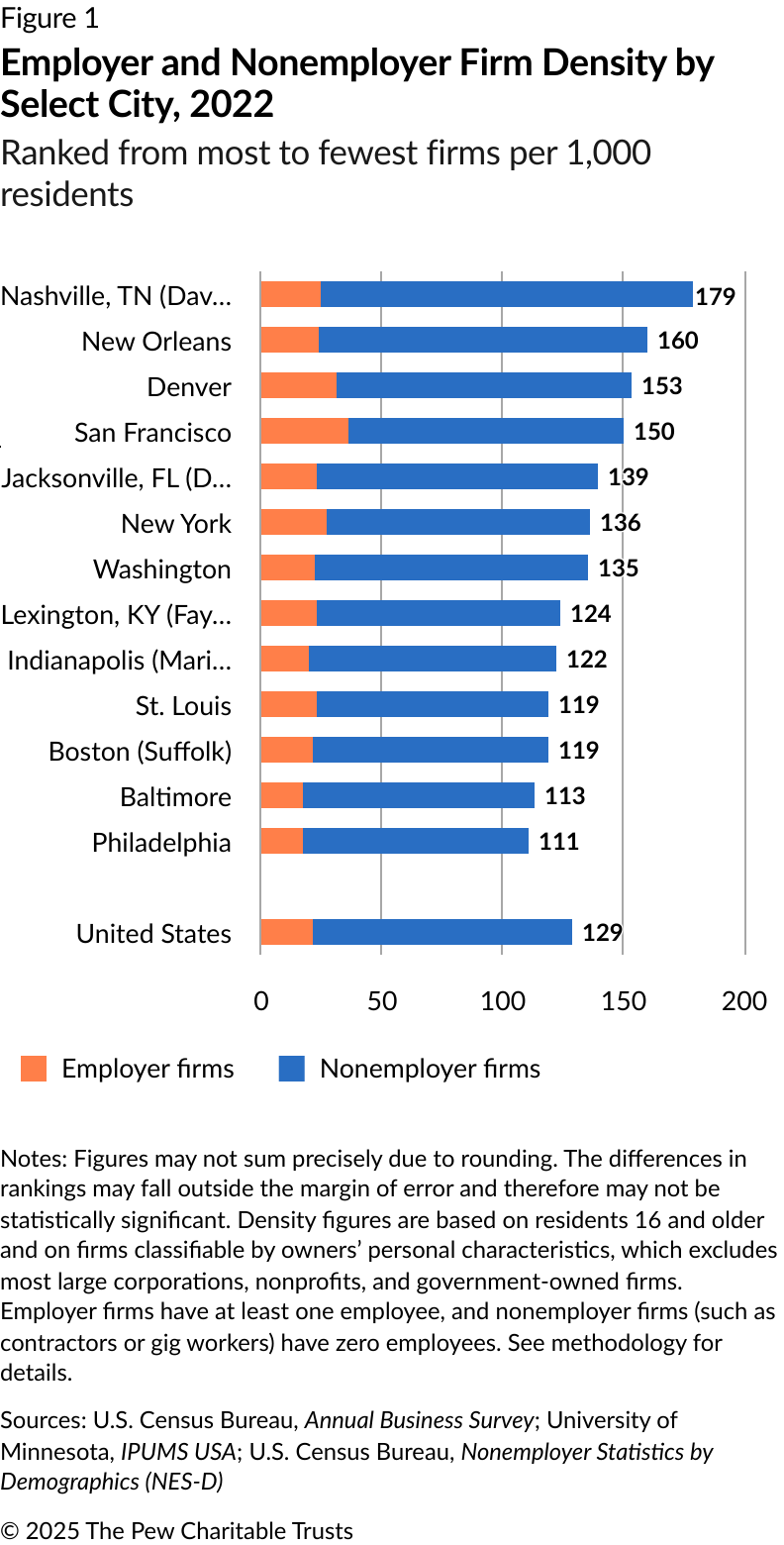 This analysis uses data on ownership characteristics from the Annual Business Survey, which is conducted jointly by the U.S. Census Bureau and the National Science Foundation and released at the county level every five years. The latest data, covering 2022, was released in December 2024. For comparisons to Philadelphia, which is both a city and a county, The Pew Charitable Trusts identified 12 other counties or county equivalents with at least 250,000 residents whose central city represented most of that population: the city of Baltimore; Davidson County, Tennessee (Nashville); Denver County, Colorado (Denver); Washington, D.C.; Duval County, Florida (Jacksonville); Fayette County, Kentucky (Lexington); Marion County, Indiana (Indianapolis); New York City; Orleans Parish, Louisiana (New Orleans); San Francisco County, California (San Francisco); Suffolk County, Massachusetts (Boston); and the city of St. Louis.