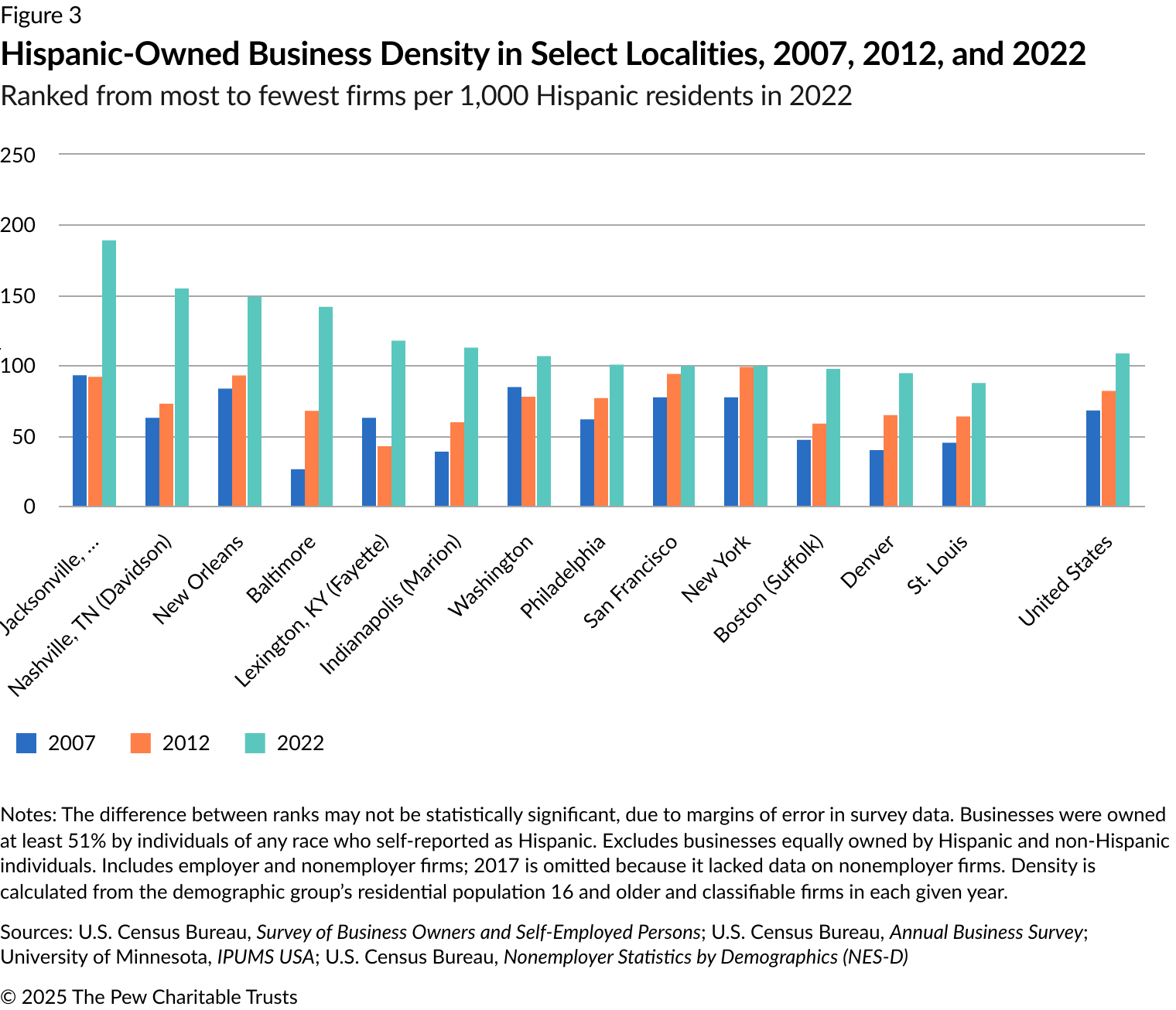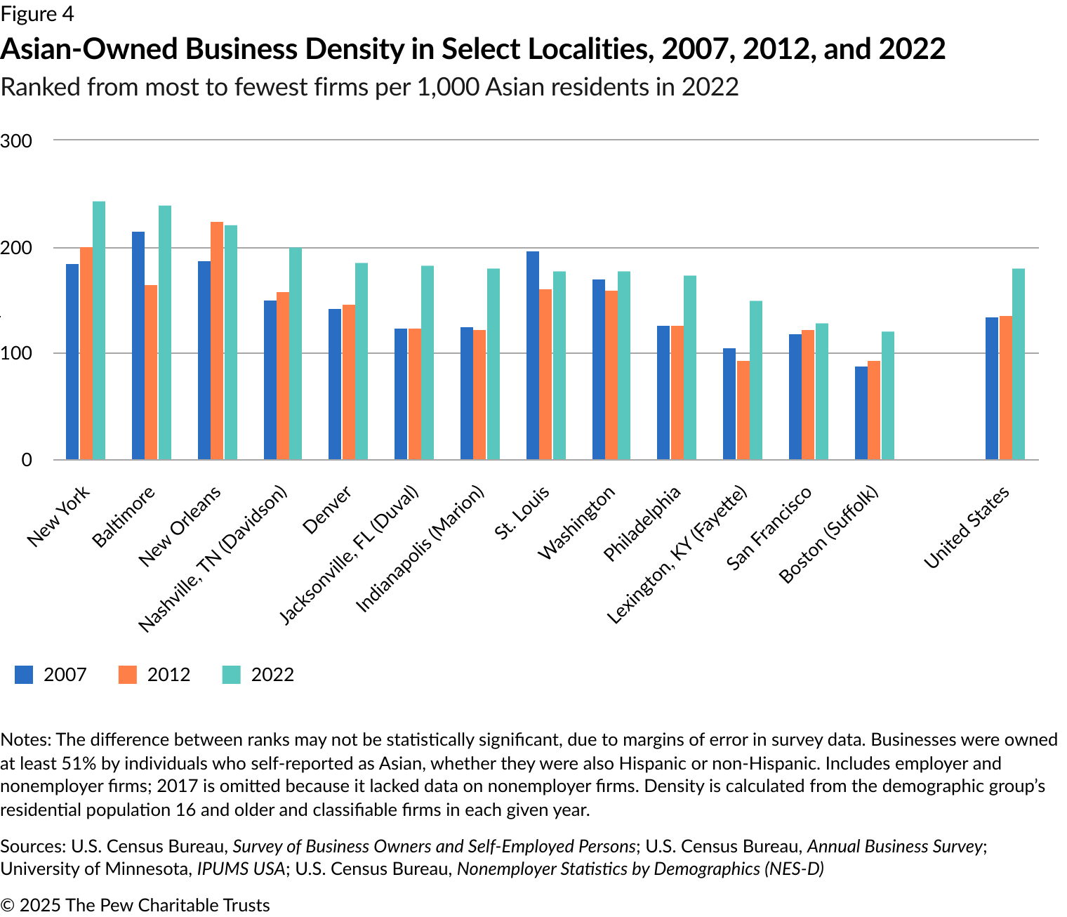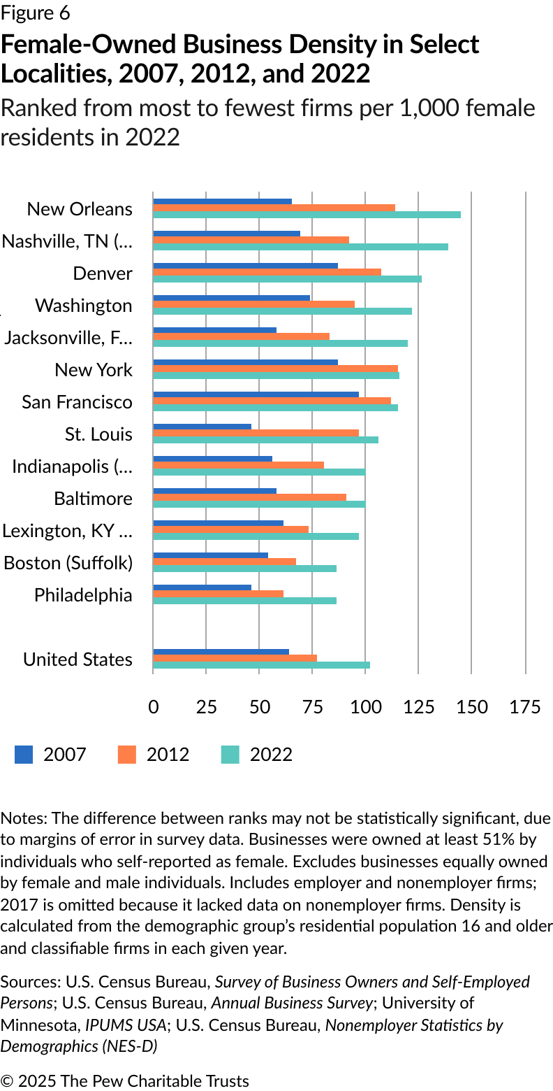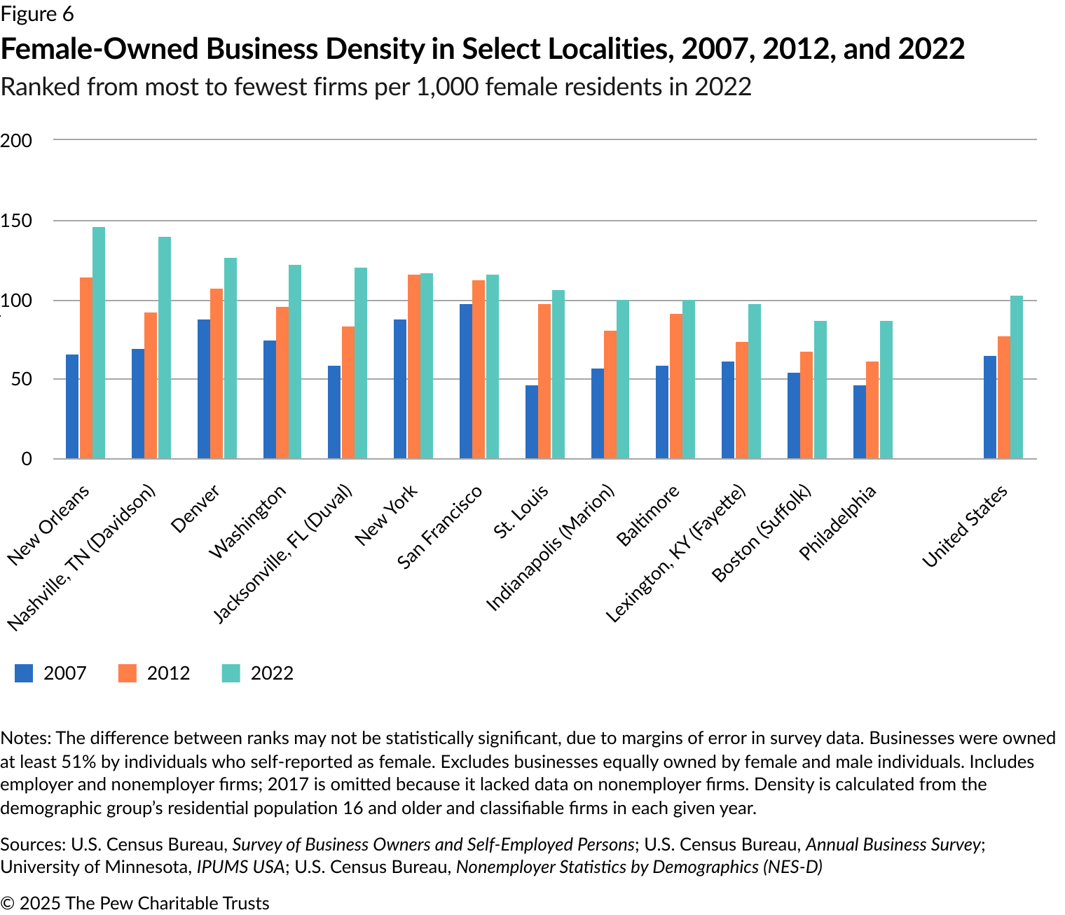 This analysis uses data on ownership characteristics from the Annual Business Survey, which is conducted jointly by the U.S. Census Bureau and the National Science Foundation and released at the county level every five years. The latest data, covering 2022, was released in December 2024. For comparisons to Philadelphia, which is both a city and a county, The Pew Charitable Trusts identified 12 other counties or county equivalents with at least 250,000 residents whose central city represented most of that population: the city of Baltimore; Davidson County, Tennessee (Nashville); Denver County, Colorado (Denver); Washington, D.C.; Duval County, Florida (Jacksonville); Fayette County, Kentucky (Lexington); Marion County, Indiana (Indianapolis); New York City; Orleans Parish, Louisiana (New Orleans); San Francisco County, California (San Francisco); Suffolk County, Massachusetts (Boston); and the city of St. Louis.