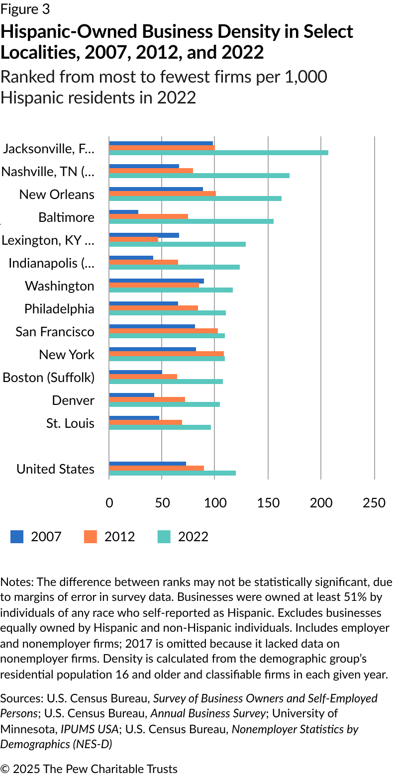 The increases also raised the Hispanic community’s business density—counting both employer and nonemployer firms—from 84 to 110 firms per 1,000 Hispanic Philadelphians. That increase roughly mirrored the gain in other localities and kept Philadelphia’s Hispanic business density around midpoint among them, although still slightly below the national level. (See Figure 3.)