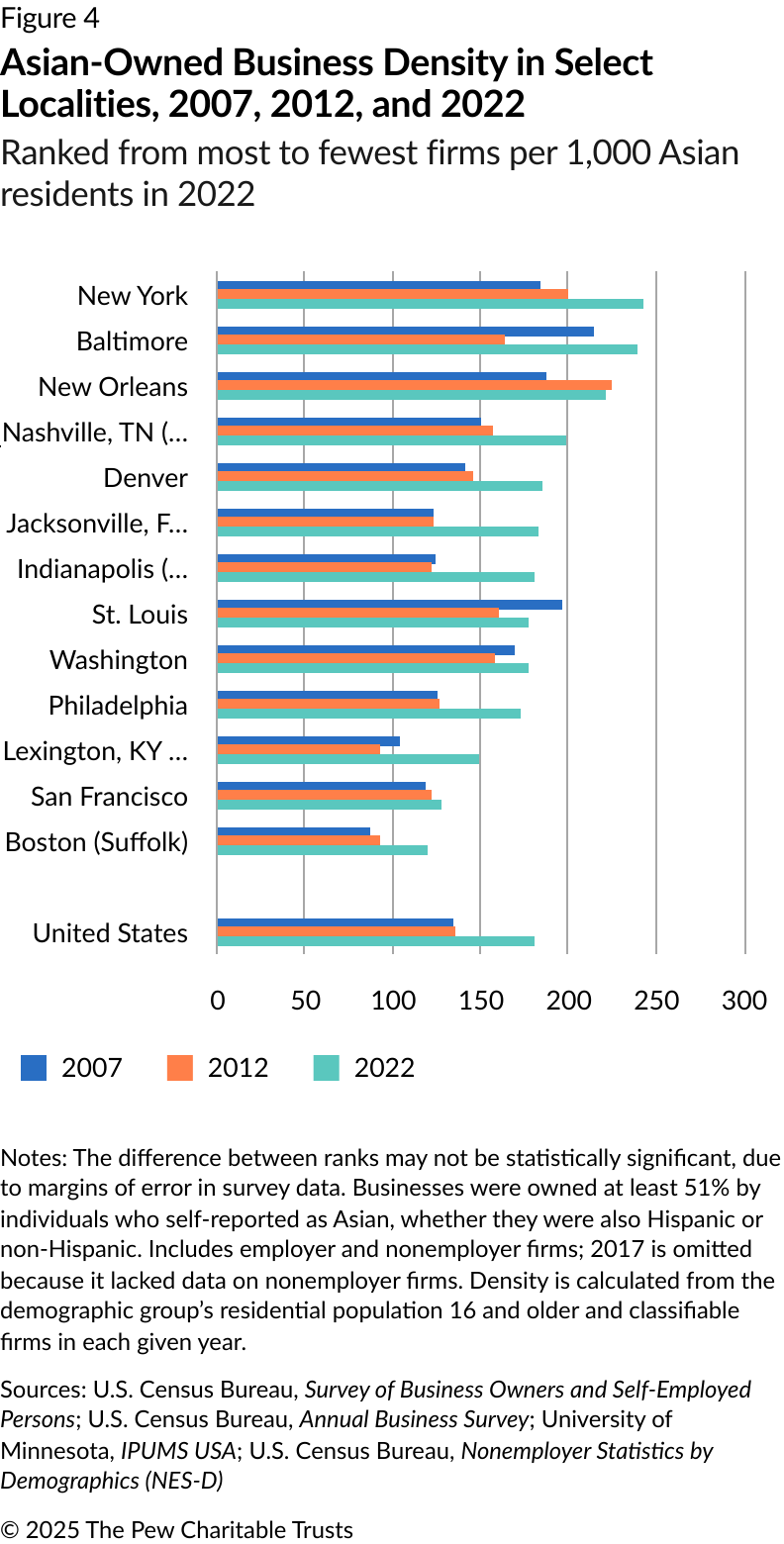 Counting both firm types, Asian business density rose over the decade from 126 to 173 per 1,000 Asian Philadelphians. That essentially mirrored the national increase and left Asian Philadelphians in the bottom half of comparison localities. (See Figure 4.)